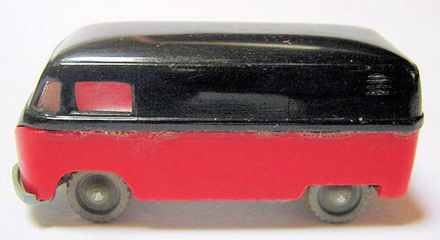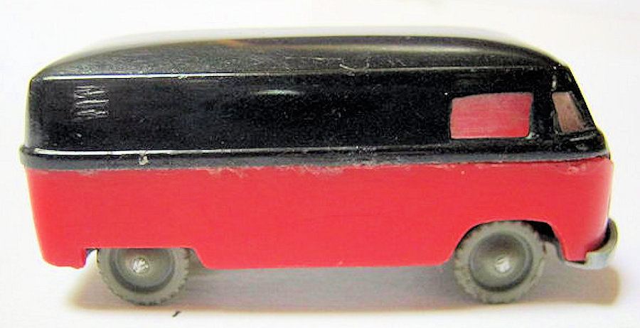 Three piece plastic parts consisting of a top or roof section, lower body and chassis in the shape of a VW Bus. This VW Panel Bus has cut out windows with a clear plastic window insert. The design is of the early 1950s with only a front bumper. Details of the front hood emblem and headlights. The chassis has some detailing and has plastic wheels with metal axles attached. The chassis is marked VOLKSWAGEN and has the round SIKU logo. The roof section, lower body and chassis are glued together.