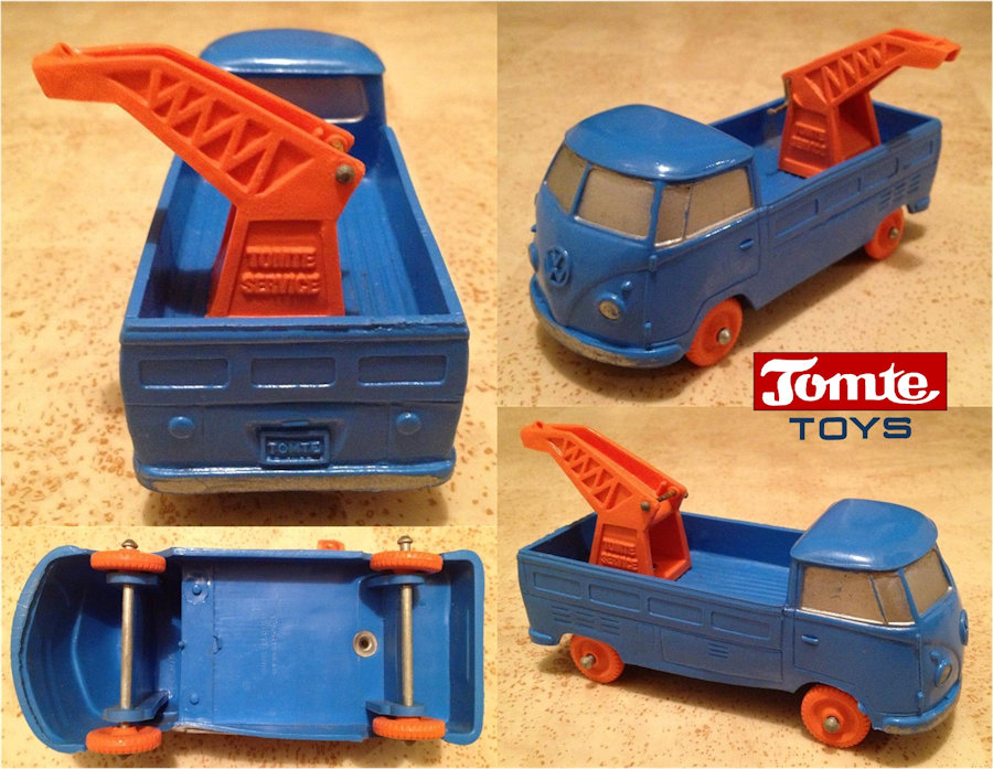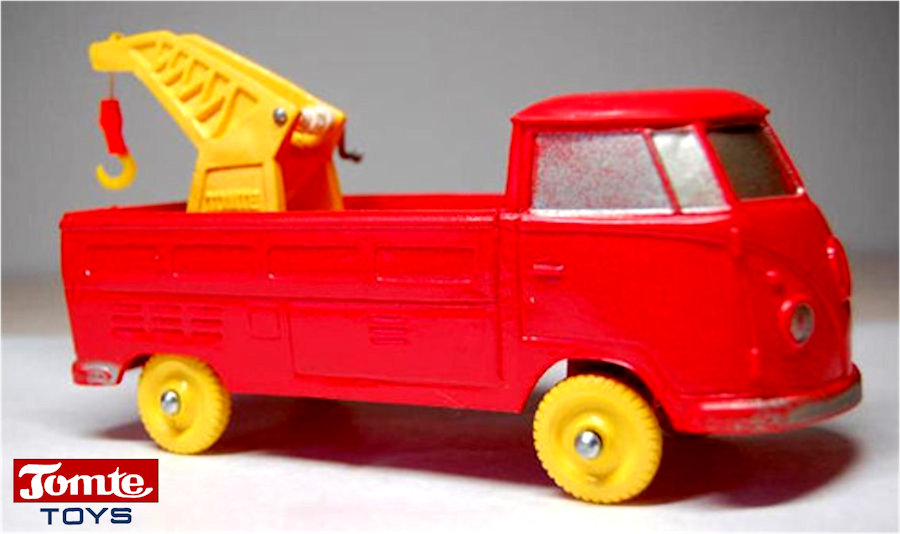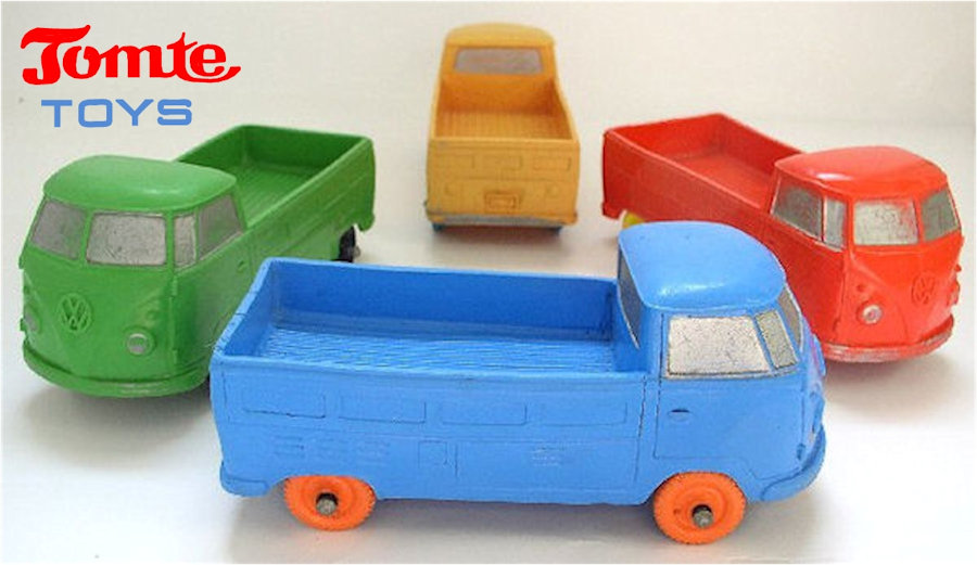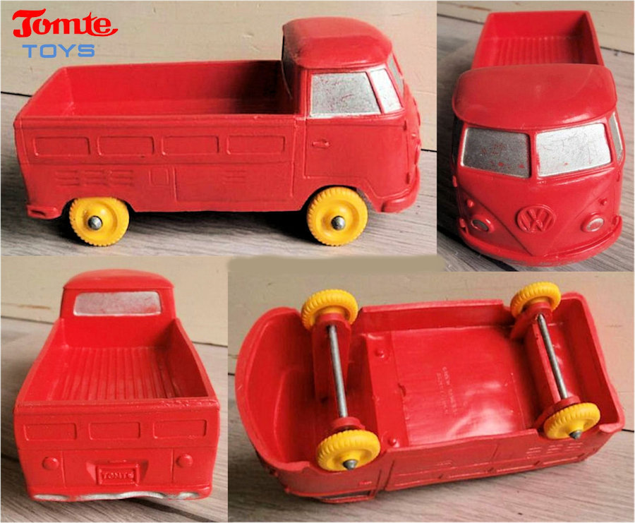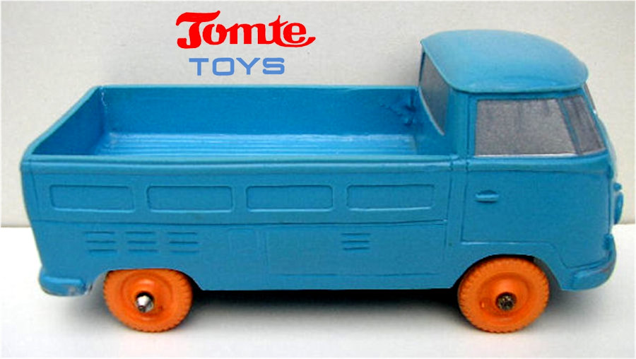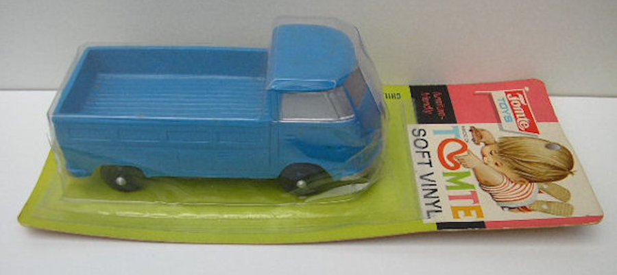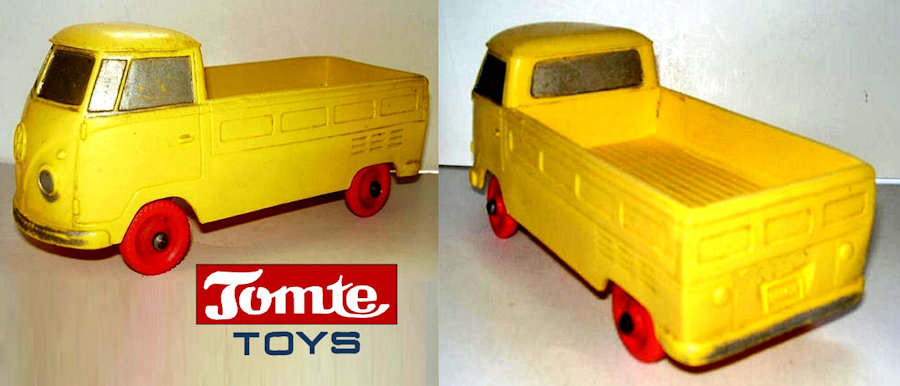 A one piece vinyl VW Pickup Bus with solid, silver painted windows and different colored wheels. Their production number was 756. If you come across a version with unpainted windows, it is the version made between 1974 and 1978. Body molded with headlights, turn signals, front VW emblem, taillights and license plate lights. There is also a wrecker truck version with a crane on the back. The wrecker truck version with unpainted windows are from 1974-1978.
