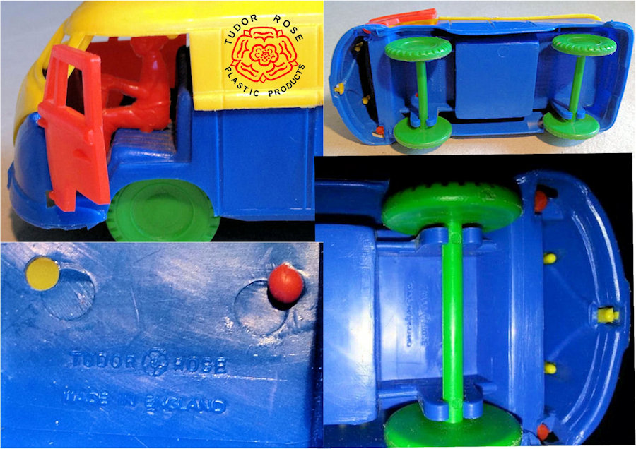 Version 1 is a multi-colored soft plastic body with cut out windows. Front doors and rear lid can be opened; side doors can't be opened. Chassis is part of the bottompart of the toy and bumpers are molded into the body. With an original driver figure at the wheel. Crude colored plastic wheels snap into the body. TUDOR ROSE and Made in England molded inside the body. The one's which are unmarked are most probably made by other manufacturers, using the same mold.