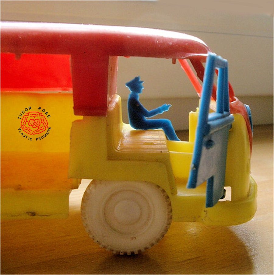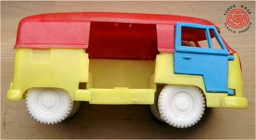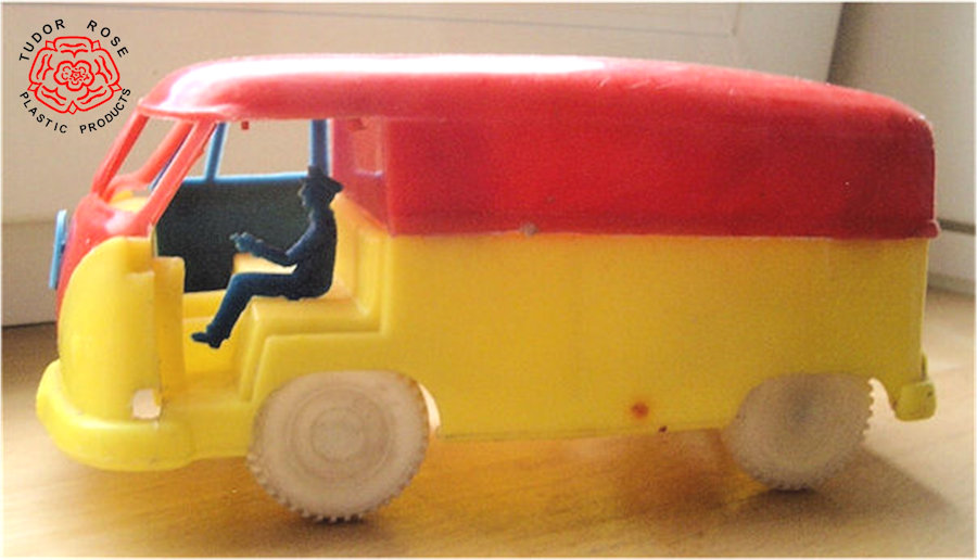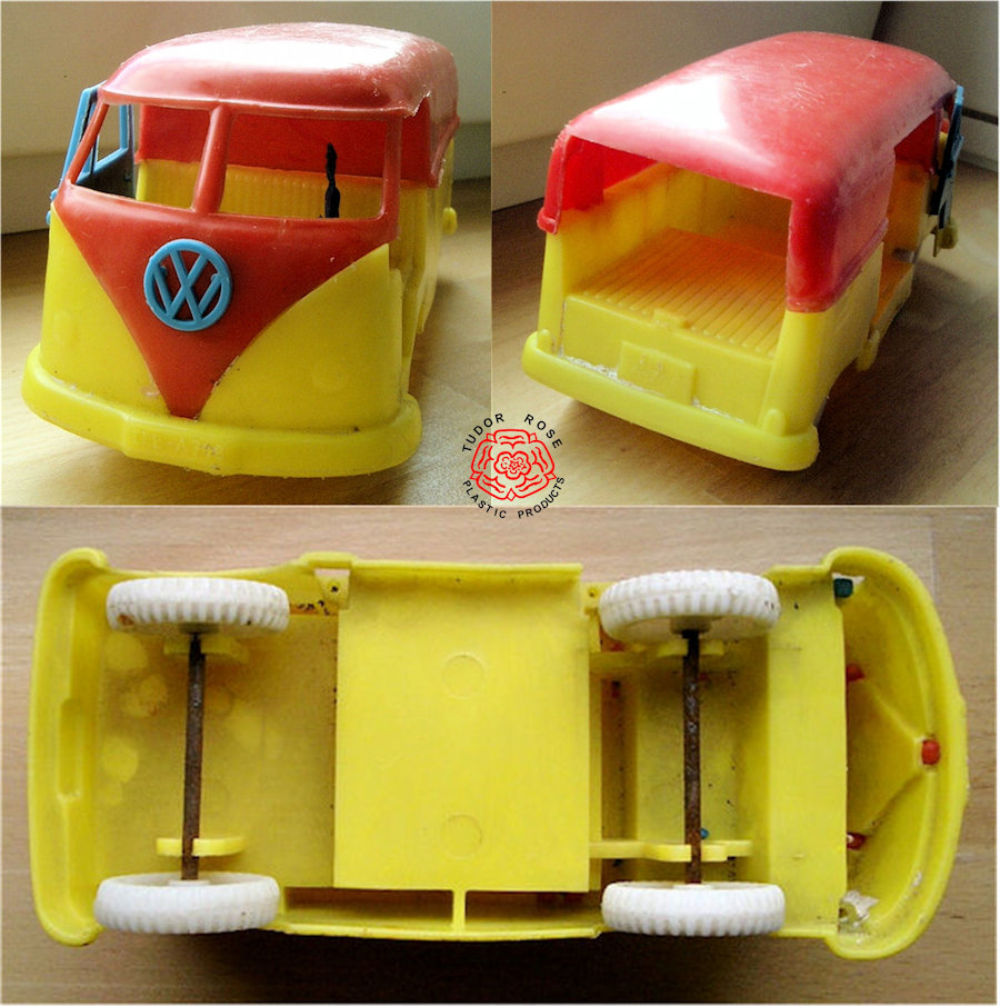Version 2 is a multi-coloured soft plastic body with cut out windows. Very much alike Version 1, except for the size. All doors and rear lid can be opened. No chassis and bumpers are moulded into the body. VW emblem at front part is snapped onto the body. The license plates are marked ERB-A 748. With an original driver figure at the wheel; the dimensions of the driver fit the smaller Version1 rather than this Version 2. Crude plastic wheels snap into the body. Please note that the bus in the pictures is missing several doors. Marked TUDOR ROSE and Made in England.