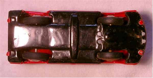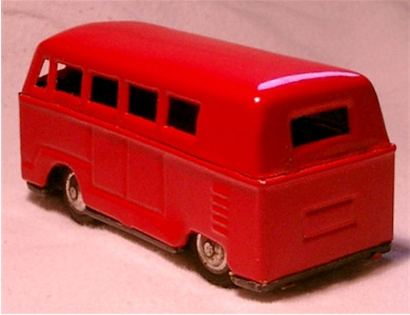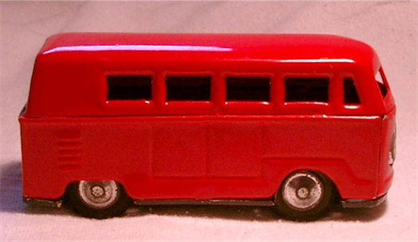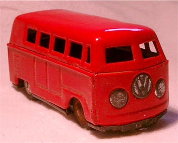 A VW Combi Bus consisting of 3 tinplate parts and a tinplate chassis. Details of the cab door seams and double door seam lines on both sides of the body. Side air louvers and license plate indentation on the engind compartment door. Tin VW front emblem and headlights. Friction motor and the wheels are made of rubber with tinplate hubcaps. No bumpers and the chassis attaches to the center body with 4 tabs. Looks like the Endoh VW Bus, but this VW Bus has a rather large tin VW emblem and large tin headlights.