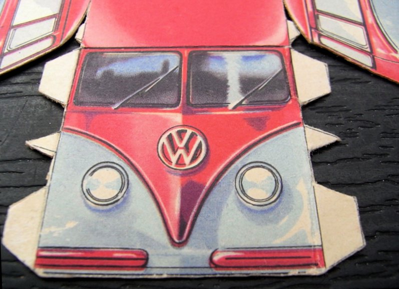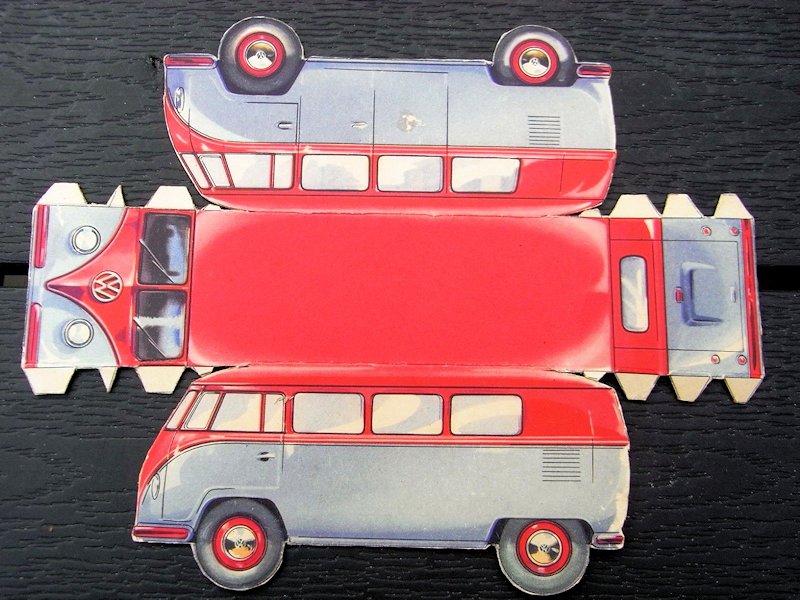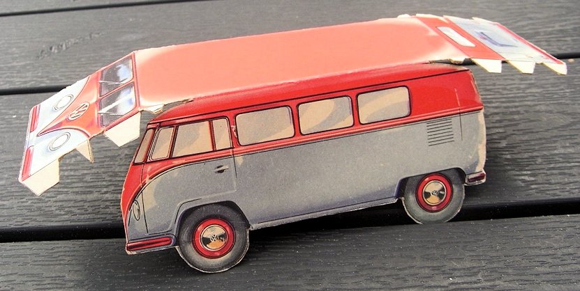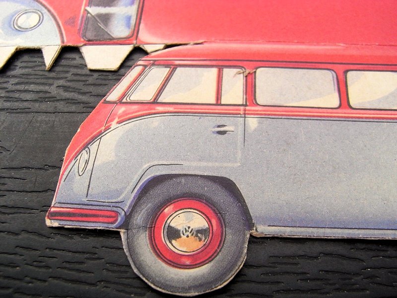 A cardboard Deluxe VW Micro Bus constructional model that was printed on a heavy card stock in the 1950s. There are various shades of blue / grey and red colors and the details are quite good for a 1950s era, 1/33 scale Volkswagen Bus. No mentioning of the manufacturer.