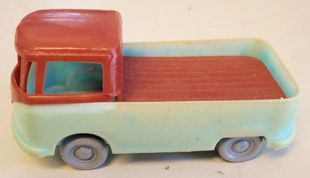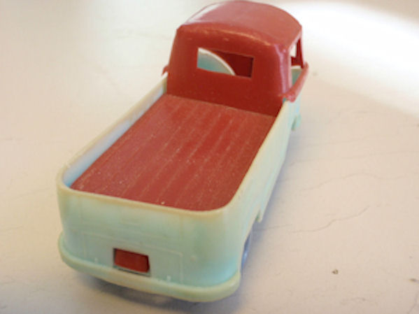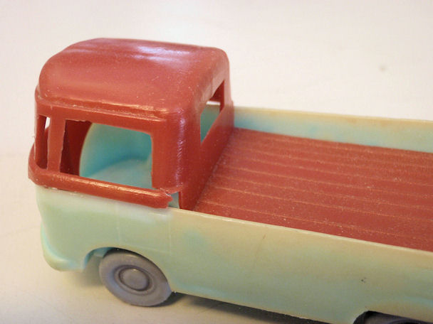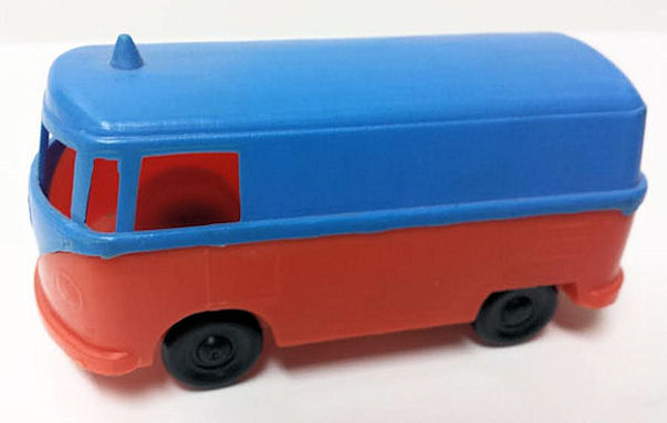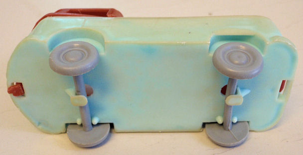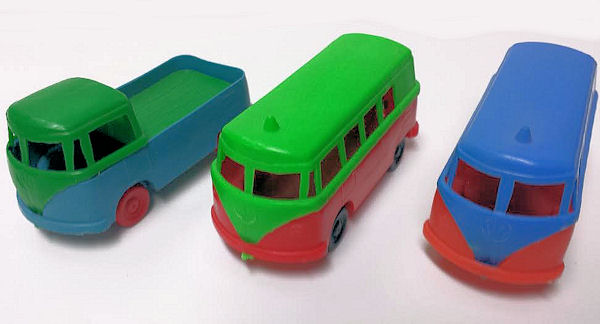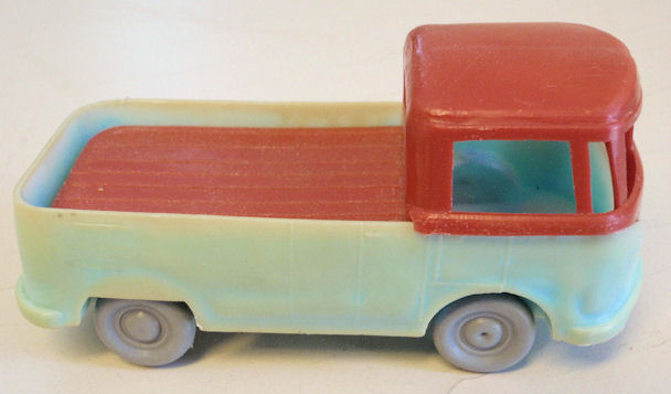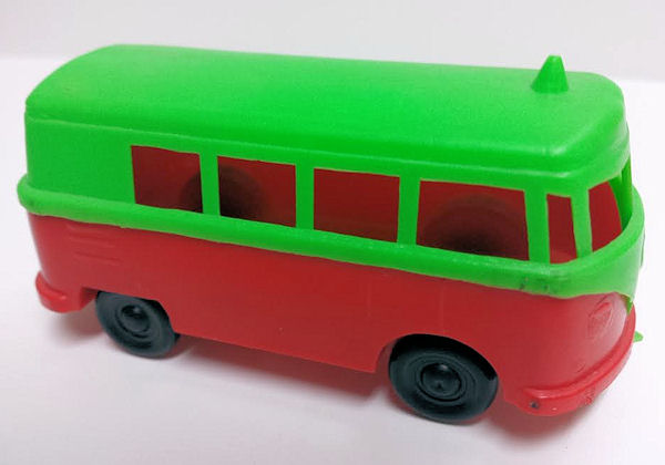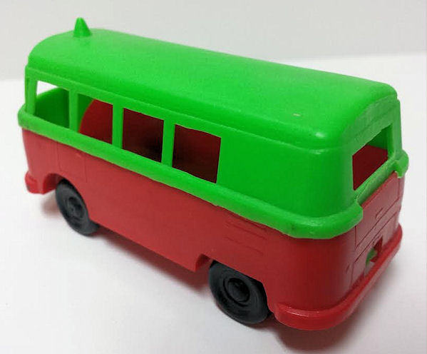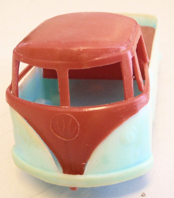 Two piece plastic body of a VW Pickup or Emergency Bus with cut out door windows and windshield. The top section forms the bed for the Pickup Bus or the Emergency bus. Details of the door seams and front hood VW emblem. Plastic chassis has a special clip to attach the grey plastic wheels with plastic axles to the chassis. No markings.