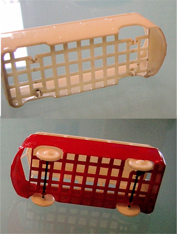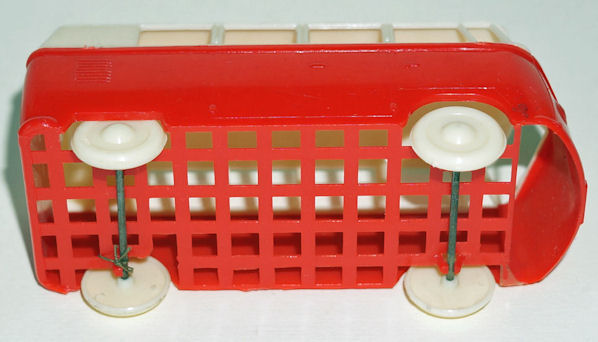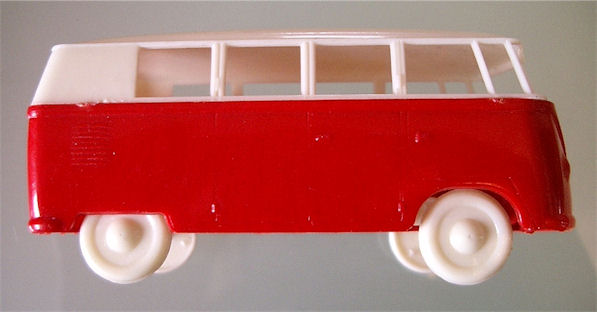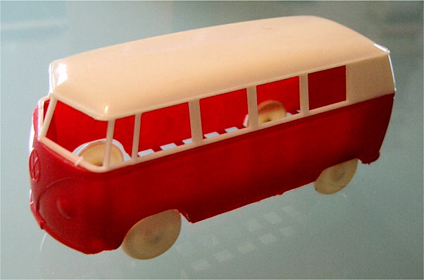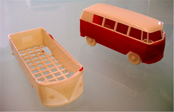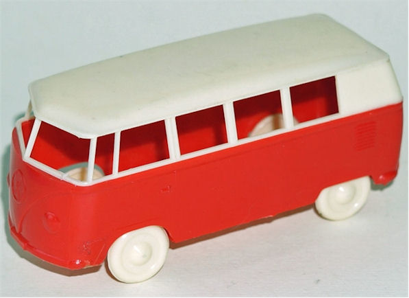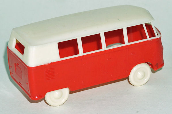 A two section plastic VW Transporter Bus with cut out windows. Details of the headlights, VW front VW emblem, door seam and engine air louvers. Barn door rear engine lid, front molded bumpers and rear bumper. The lower body section forms the chassis which is a crisscross grid design. White plastic wheels on metal axles snap on. Seldom found and no markings. It is believed to be produced in Belgium.