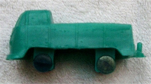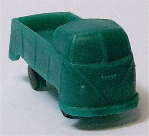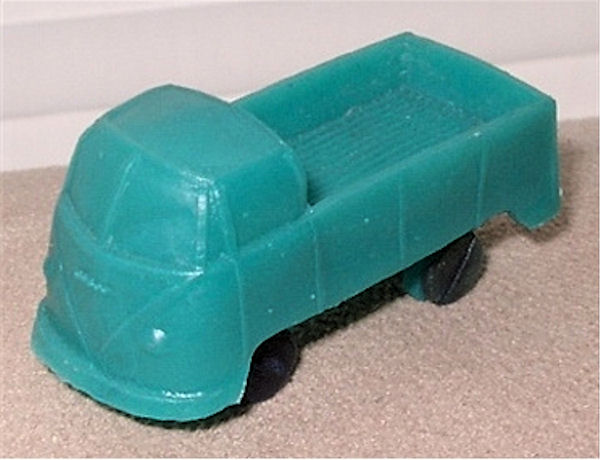 A plastic body in the shape of a VW Pickup Bus with solid windows and details of the front, headlights and door seams. Instead of the VW emblem on the front, it has 5 raised dots. No chassis and the black plastic wheels with axles attach to the body with pillars of the body. Only a front bumper, no rear bumper and a tow hook molded into the rear of the body. No markings.