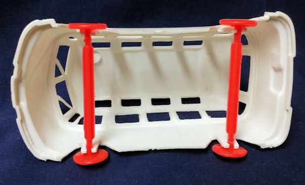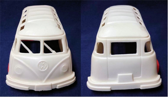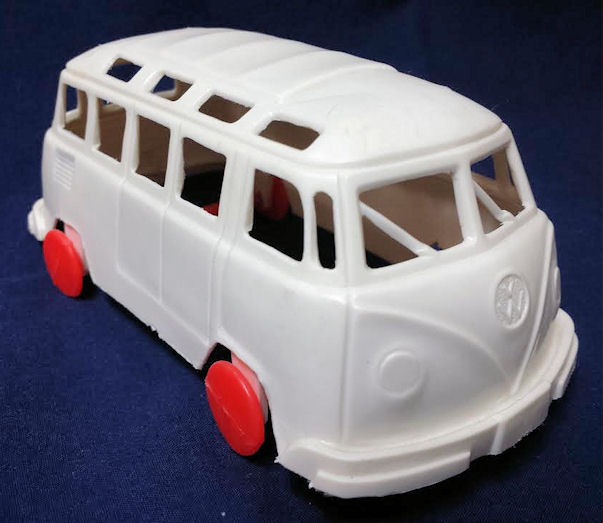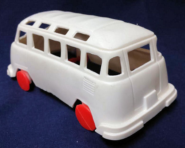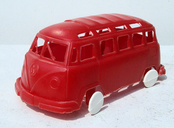 An early model Deluxe VW Samba Bus made of plastic with cut out windows. Details include 25 windows, headlights, front VW emblem, front and rear bumpers with license plates. Side air louvers, sunroof top and molded windshield wiper blades. No chassis and the red or white plastic wheels with axles snap onto the body. No markings.