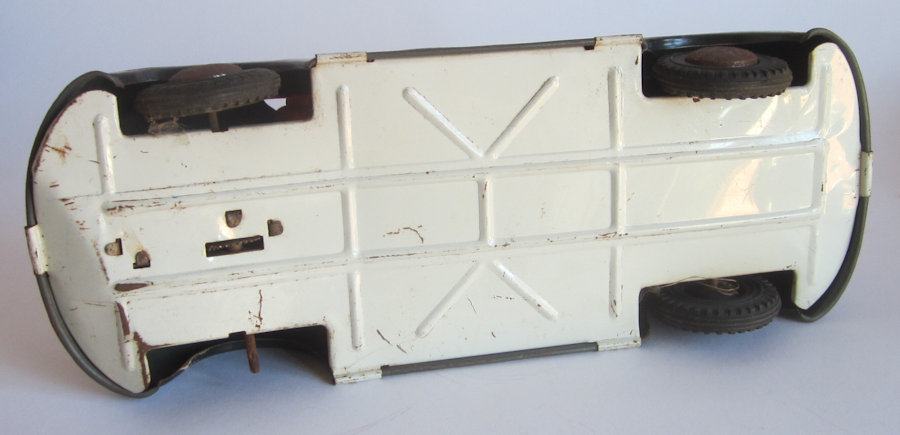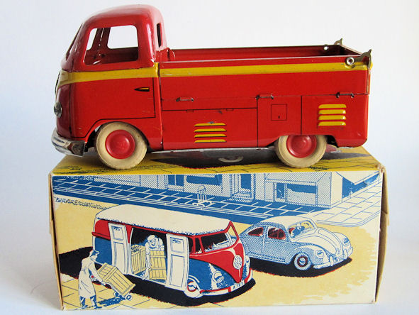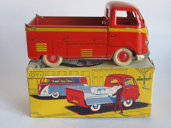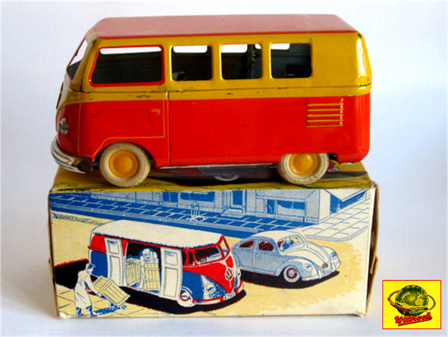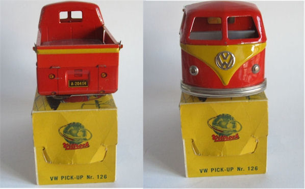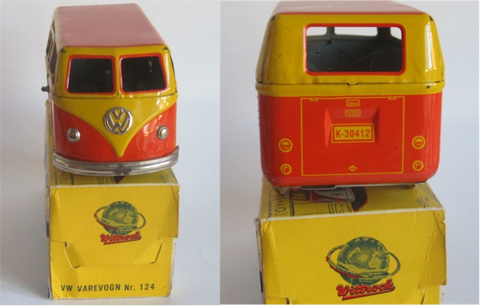 Tin lithographed VW Bus in two styles, a Panel Van and a Single Cab with cut out windows. The Panel Van and Single Cab both have a nice red/yellow lithograph design with details. Details include door seams and handles. The Panel Van VW has the lines of a barn door style for the engine door, taillights, and license plate light. License plate number of 30412. Tin headlights, VW emblem and only the front bumper attach to the body. The Single Cab Bus has the cargo space side doors that fold down. License plate number of A-20414. Both Busses have a friction motor with rubber tires. The Busses came in a very colorful cardboard box (VW PICKUP Nr.126, VW VAREVOGN Nr. 124) with nice scene drawings on the box. Very similar and considered to be a copy of the GÖSO VW Bus.