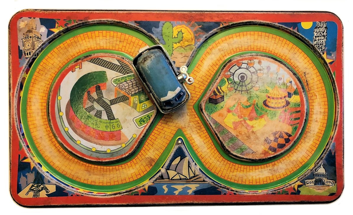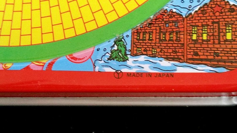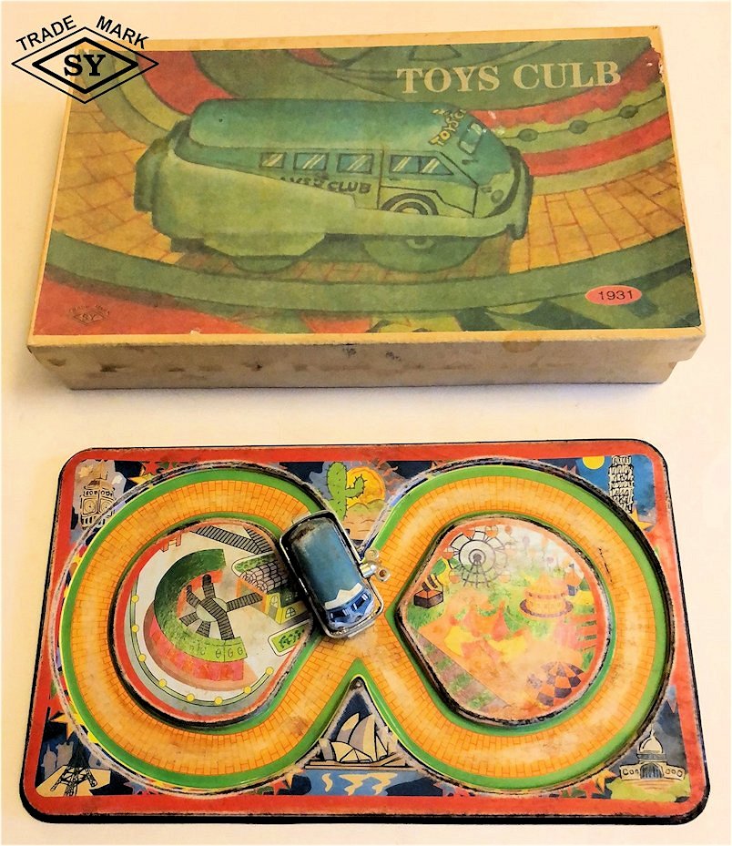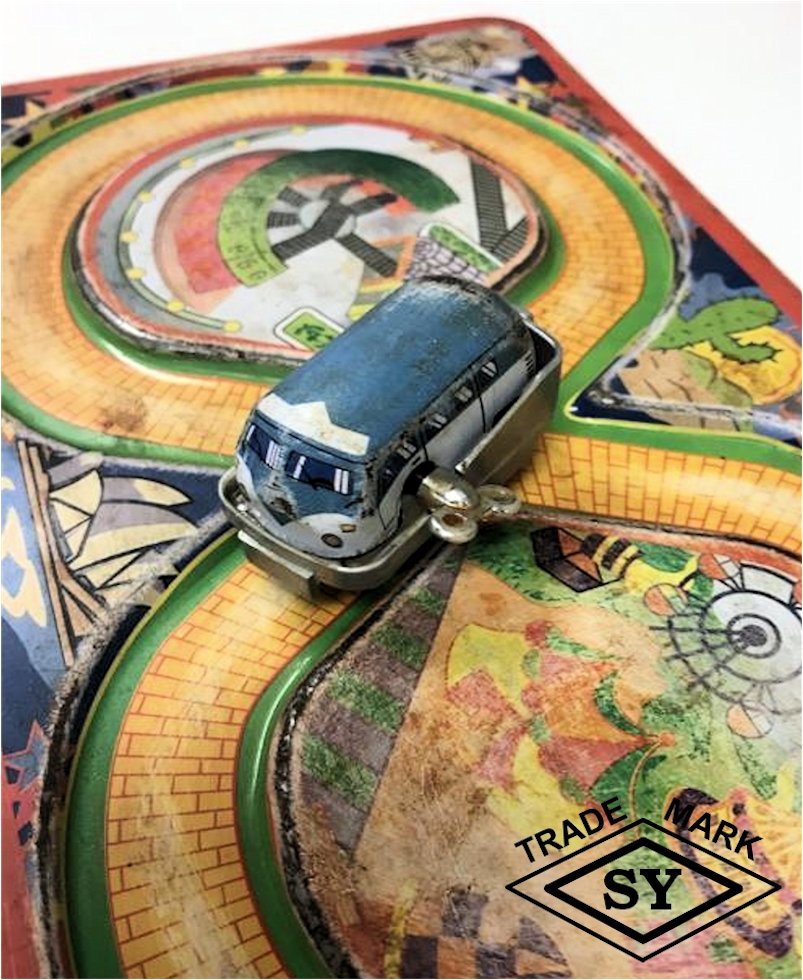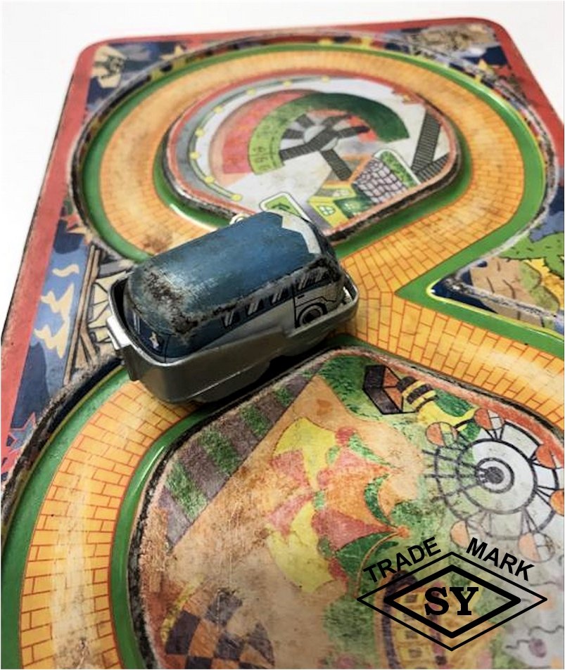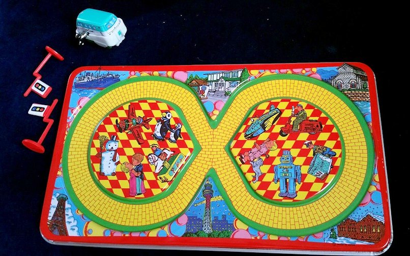 In the early 1960s, YONEYA produced a very nice lithographed figure 8 track platform set that featured a Vintage VW Bus as the vehicle. The very colorful track platform looks like offset bricks to create the roadway along with a green grass edge. In the background graphics are of known world points of interests such as the Eifel Tower, Big Ben, leaning Pisa Tower, Sydney Opera House, Taj Mahal and a desert cactus scene, perhaps Arizona. There is also center graphics of a train track switching yard and a carnival park scene. The track platform measures 15 cm X 26 cm or about 6 in X 20.5 in.