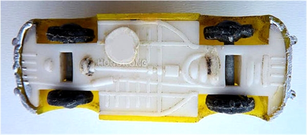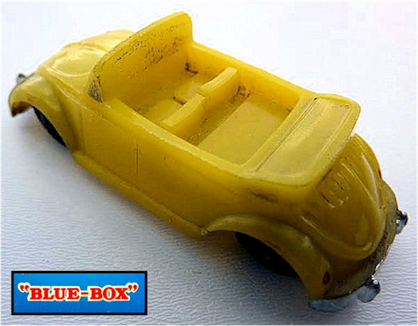 An early Volkswagen Convertible body made of plastic with the folded top down. Solid windshield and basic seat details. Headlights, front and rear bumpers painted silver and the taillights have a dab of red paint. Some are found without any painted details as well. 10 air louvers on the rear deck lid. Chassis has some ribbed details, drive shaft and an exhaust pipe with muffler. The plastic chassis has black plastic tires on metal axles. Chassis molded with HONG KONG.