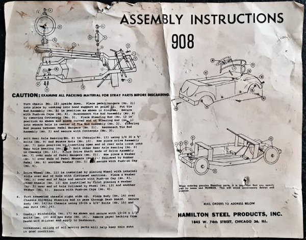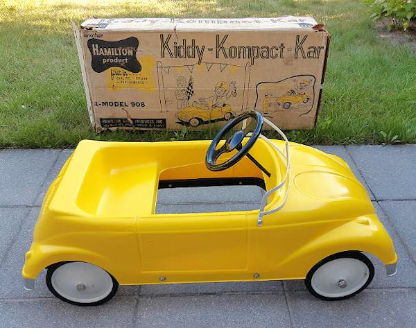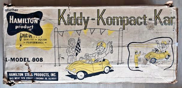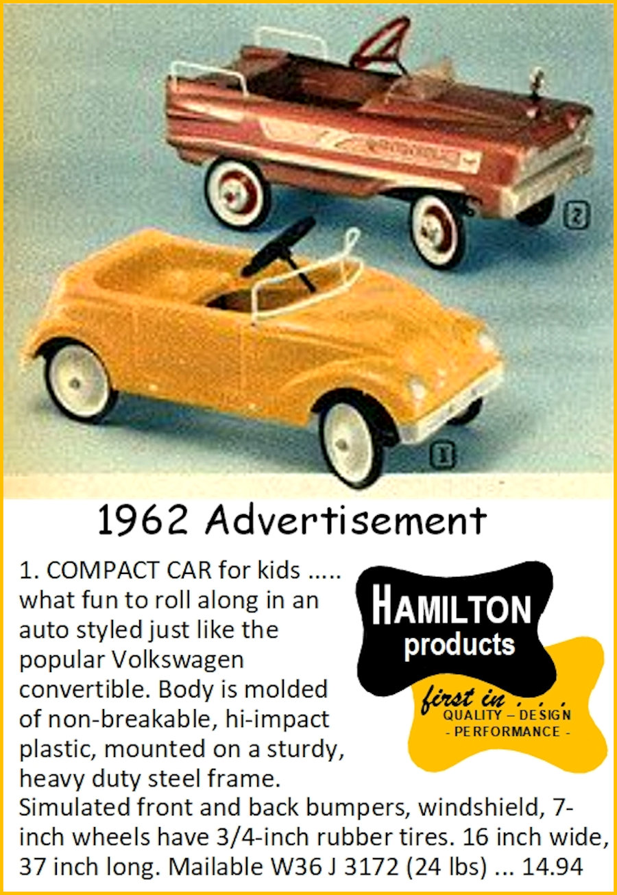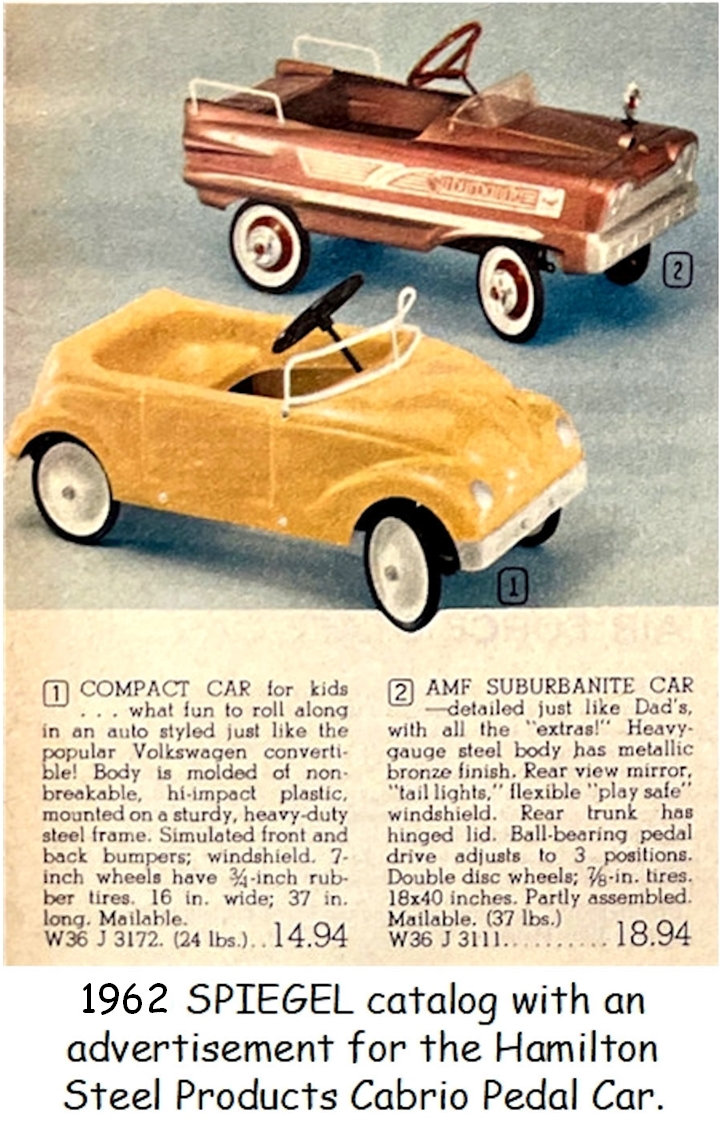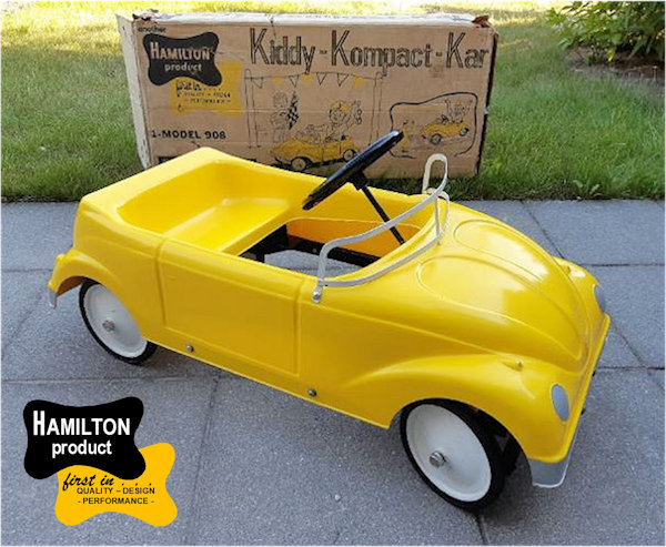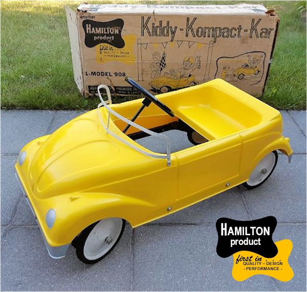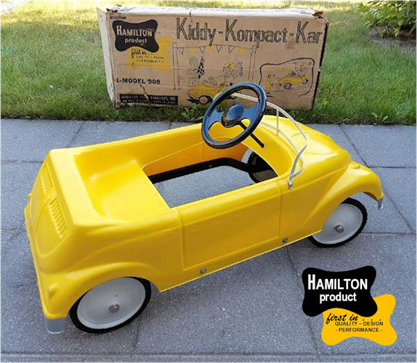 HAMILTON STEEL PRODUCTS of Chicago, Illinois, USA, was established in 1933. It was a manufacturer of garden equipment and children's toys, including a popular line of steel pedal Jeeps manufactured from the late 1950s through the mid-1960s. The Company declared bankruptcy in 1964, going out of business in 1965. As a cheaper alternative to the all-steel Jeep, HAMILTON STEEL PRODUCTS also produced fiberglass alternate bodies to fit their Jeep chassis. Two known examples are a 1958 Chevrolet Impala and a Volkswagen Cabrio.