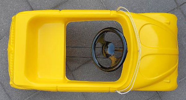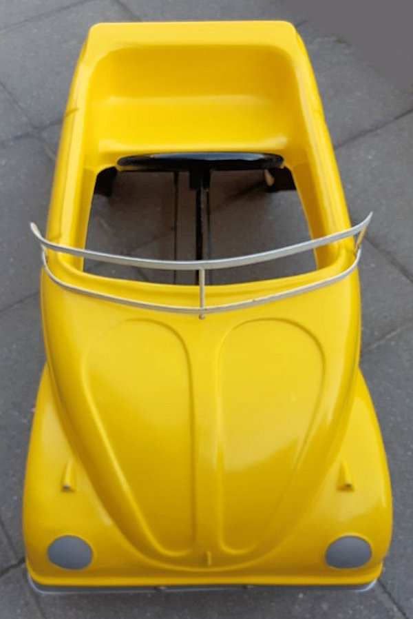 Large fiberglass Volkswagen Cabrio body on a heavy steel pedal car chassis with a steel windshield made of welded steel stock. The wheels were steel rims with rubber tires with "H" logo center caps, and stamped steel steering wheel with center "H" logo. The body was bright yellow gel coat, and body details included front hood, door outlines, detail of headlights and taillights, a folded convertible top. The decklid has details of a pre-1958 VW Cabrio design. The HAMILTON STEEL PRODUCTS catalog number is 1-MODEL 908.