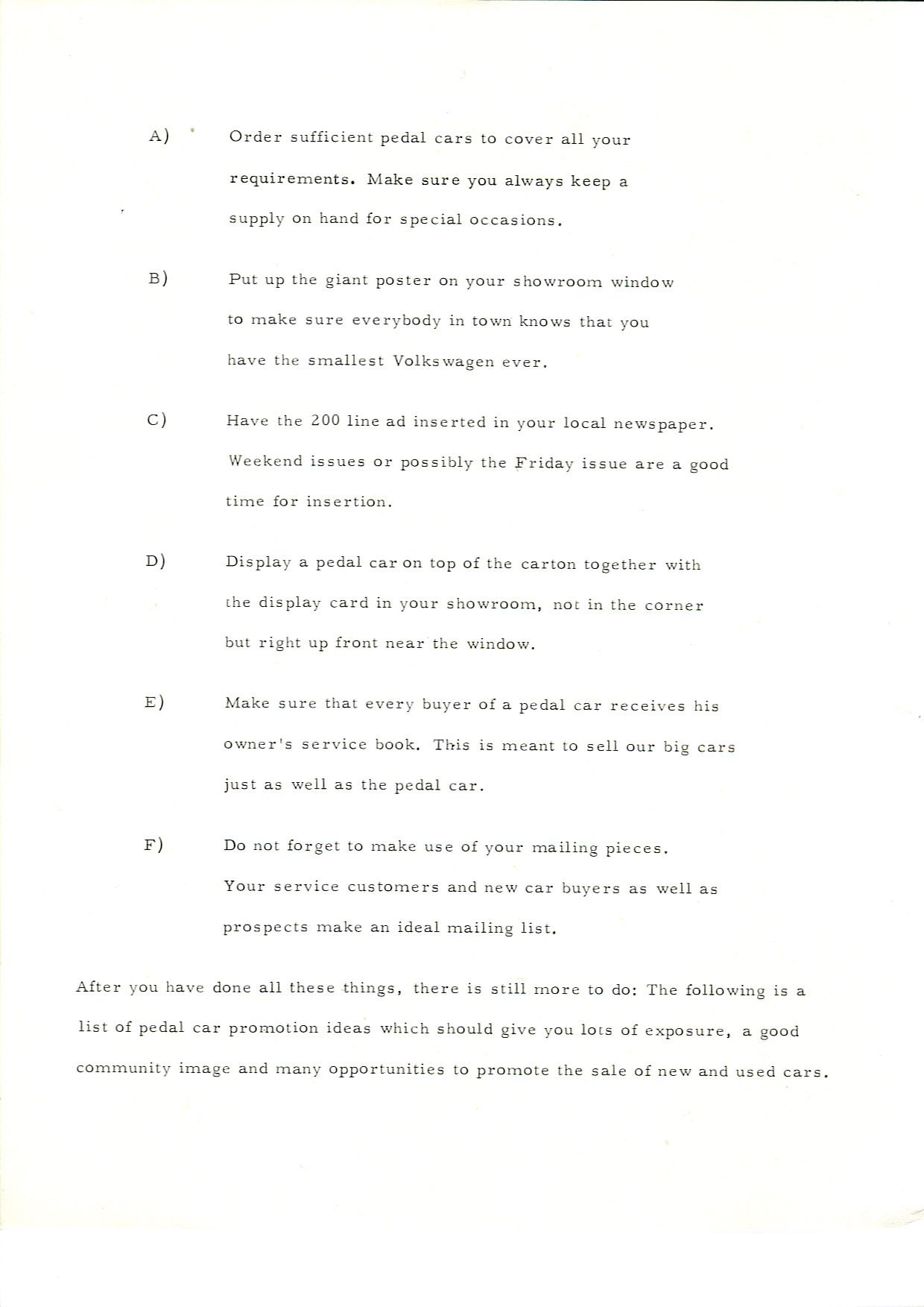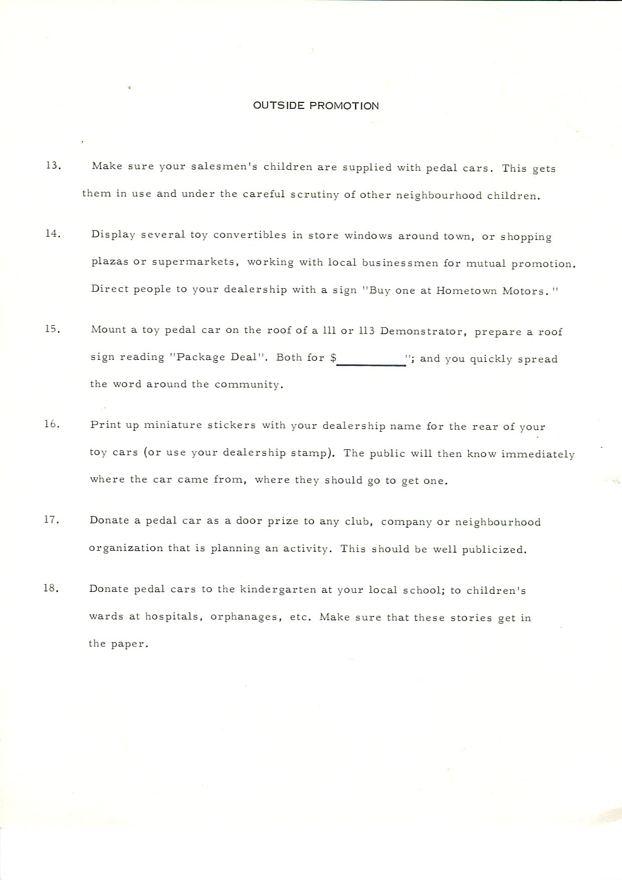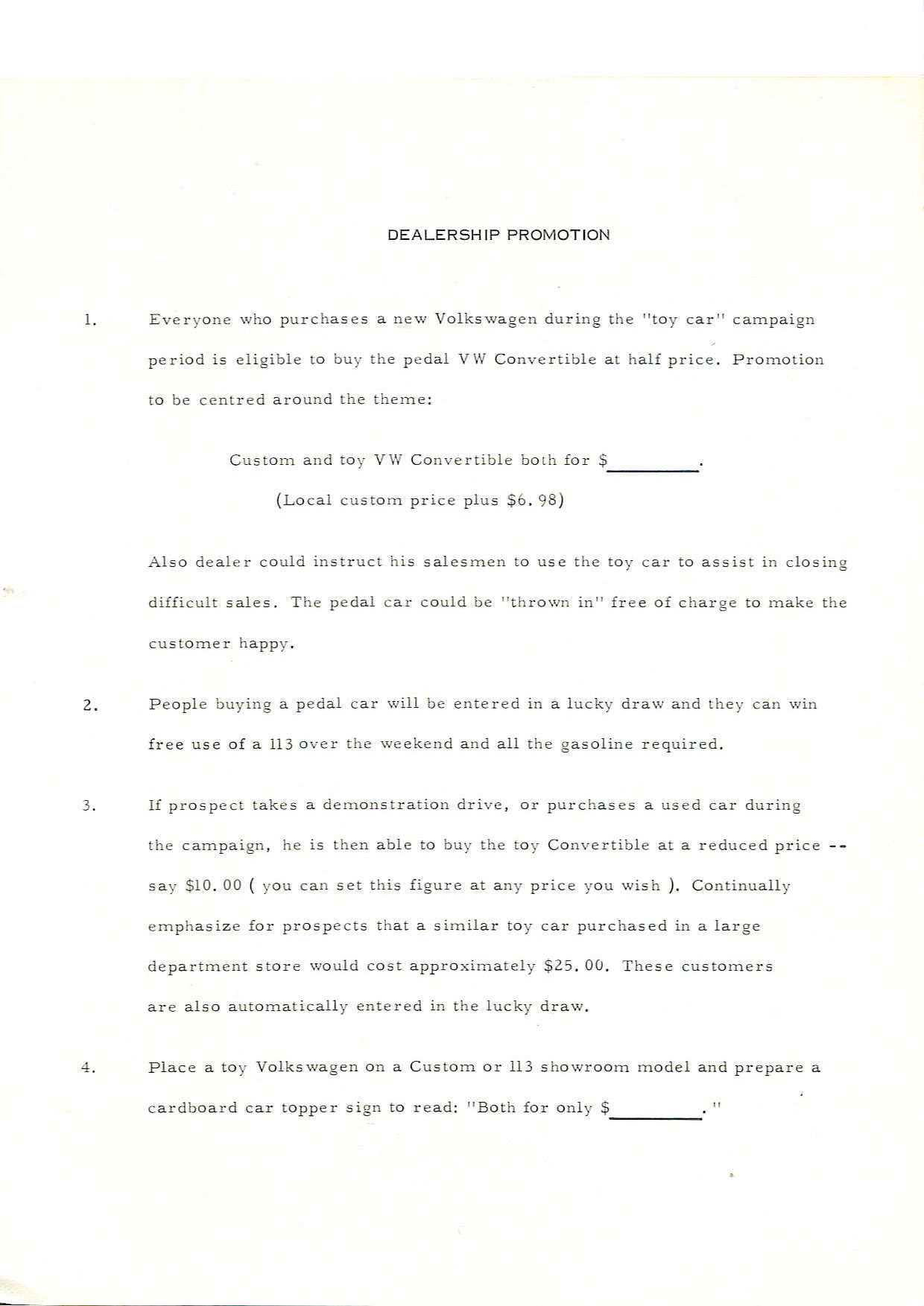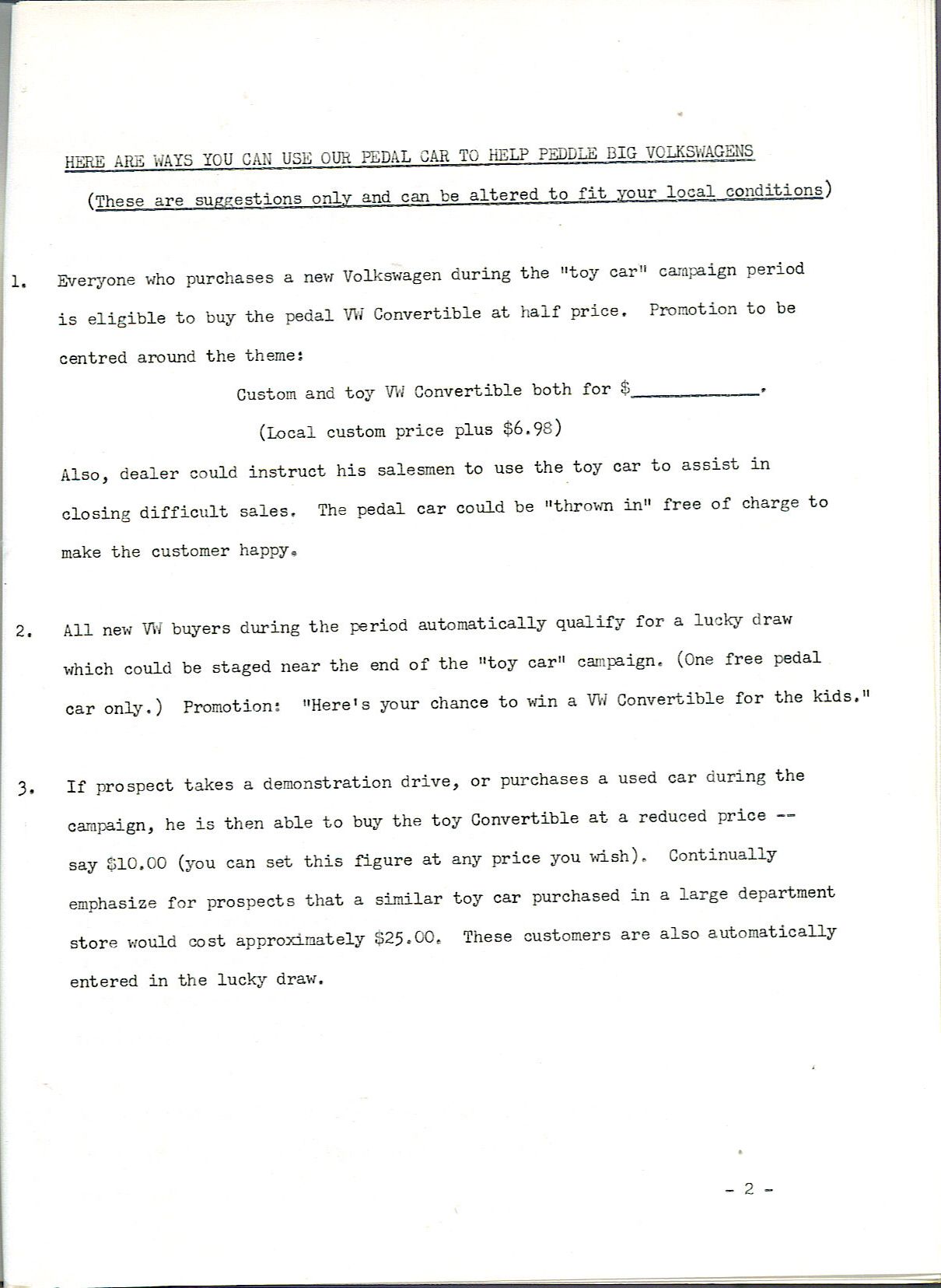 Some of the Volkswagen dealerships in Canada had a Pedal Car Promotional Campain. The promotion used the RELIABLE TOY pedal car to help sell the real size VWs at the time. Here are copies of the documents outlining a check list of things to do for the campaign.