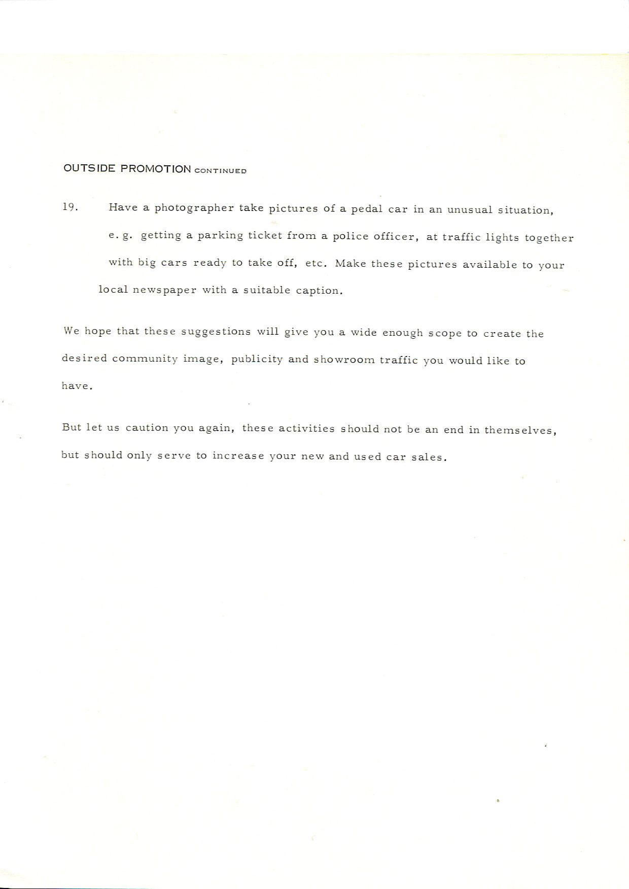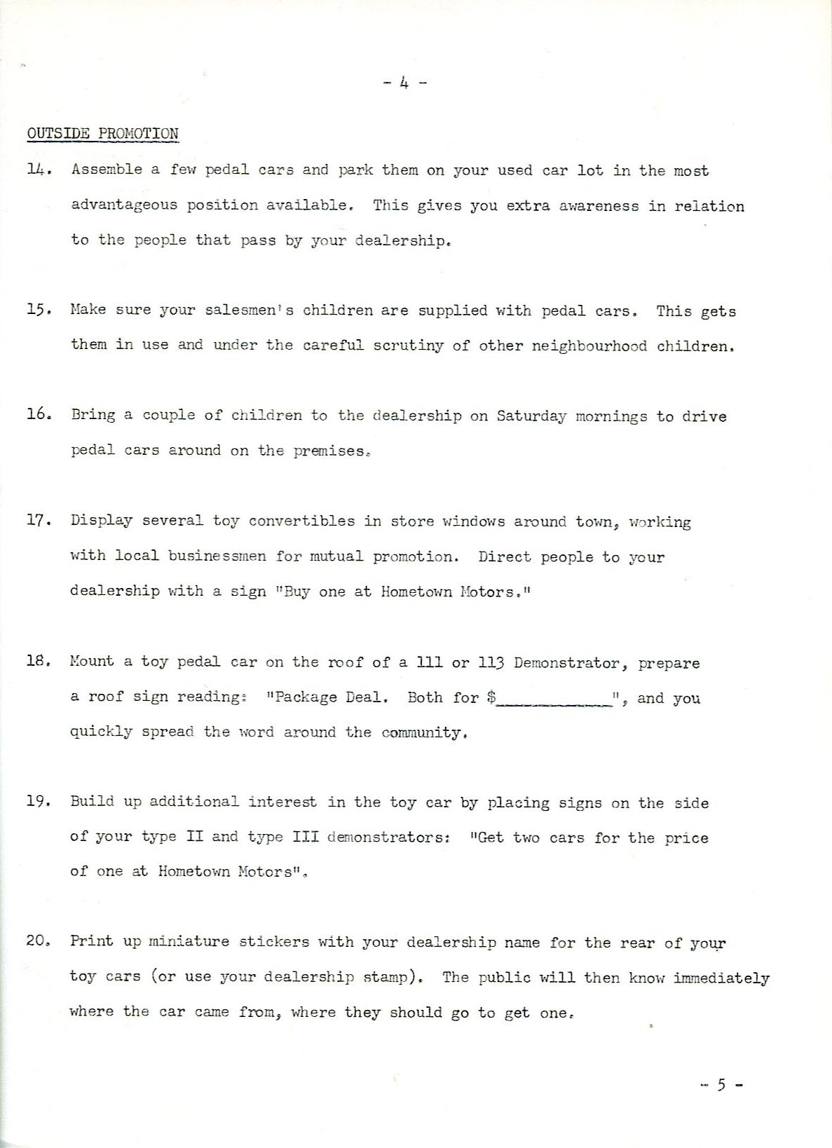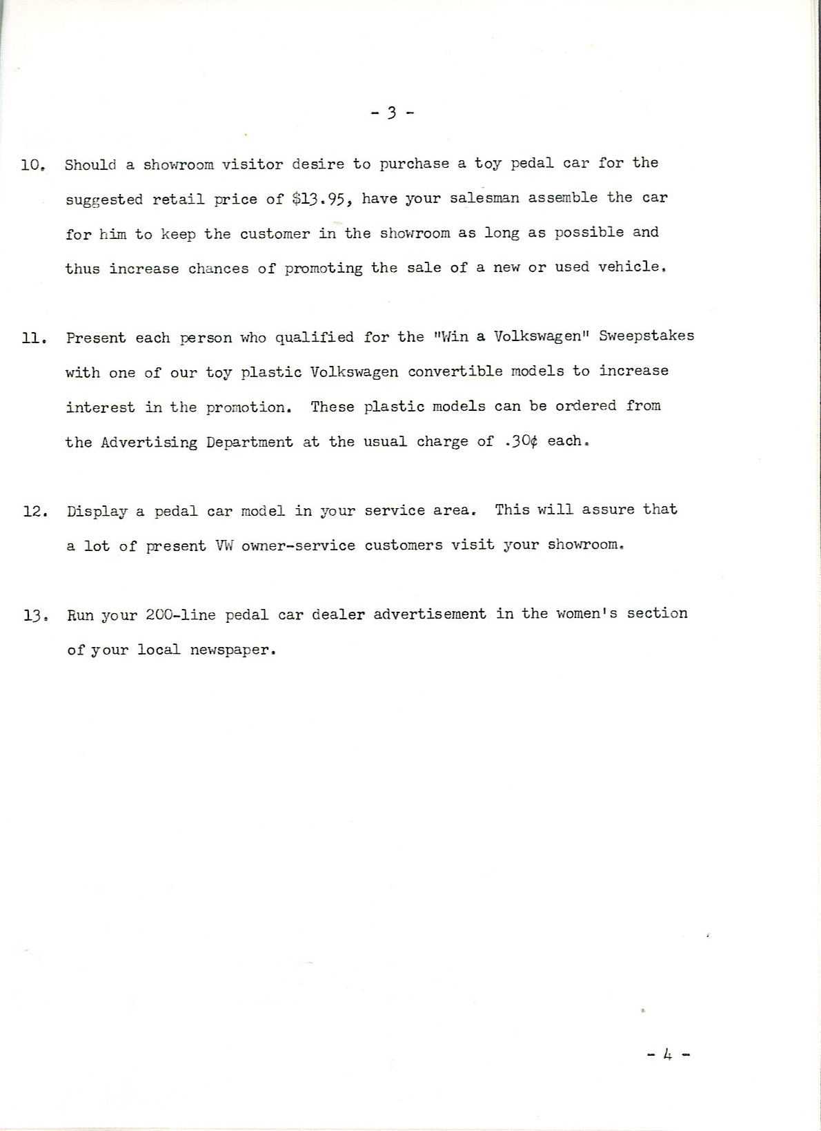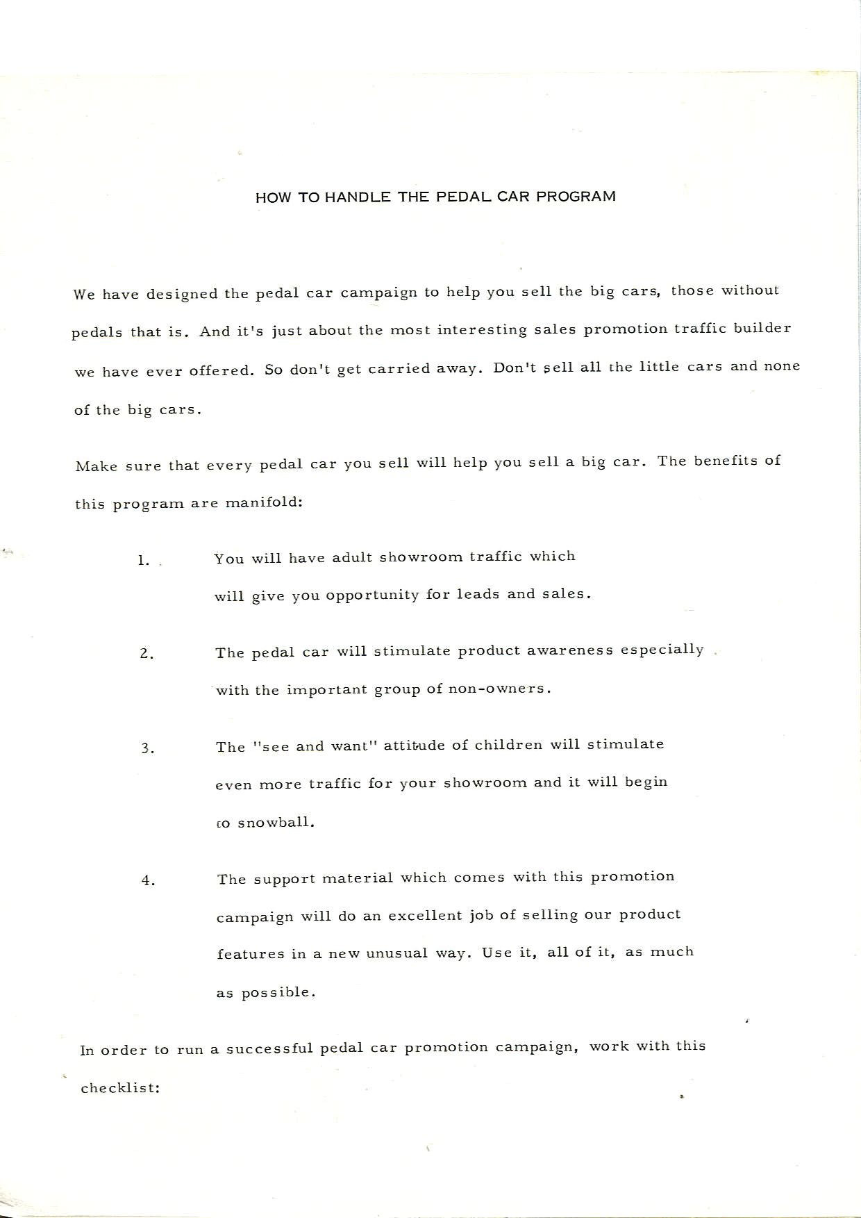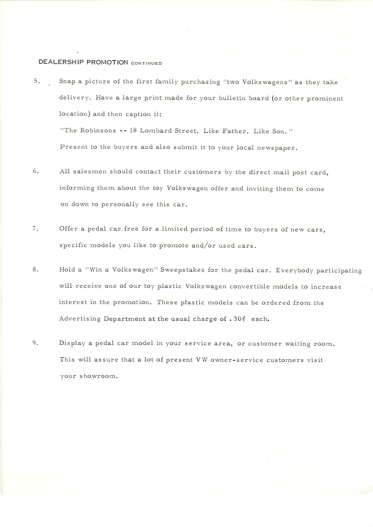 Some of the Volkswagen dealerships in Canada had a Pedal Car Promotional Campain. The promotion used the RELIABLE TOY pedal car to help sell the real size VWs at the time. Here are copies of the documents outlining a check list of things to do for the campaign.