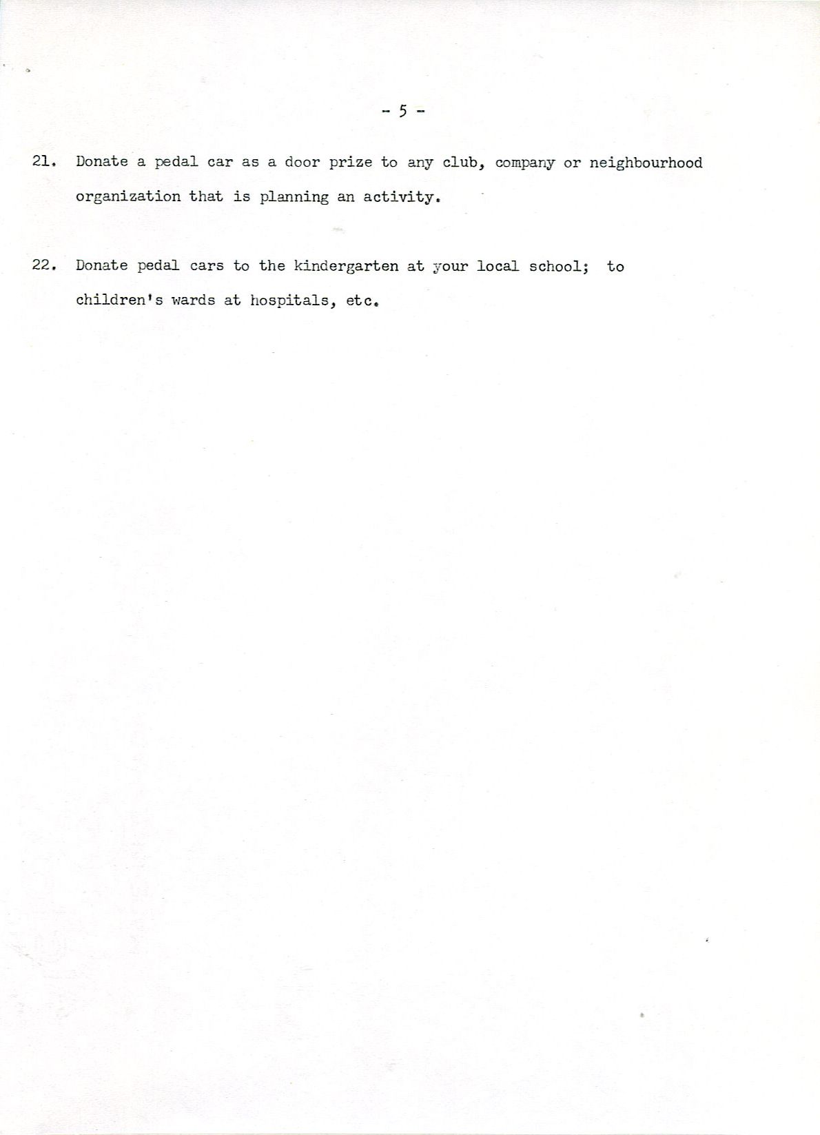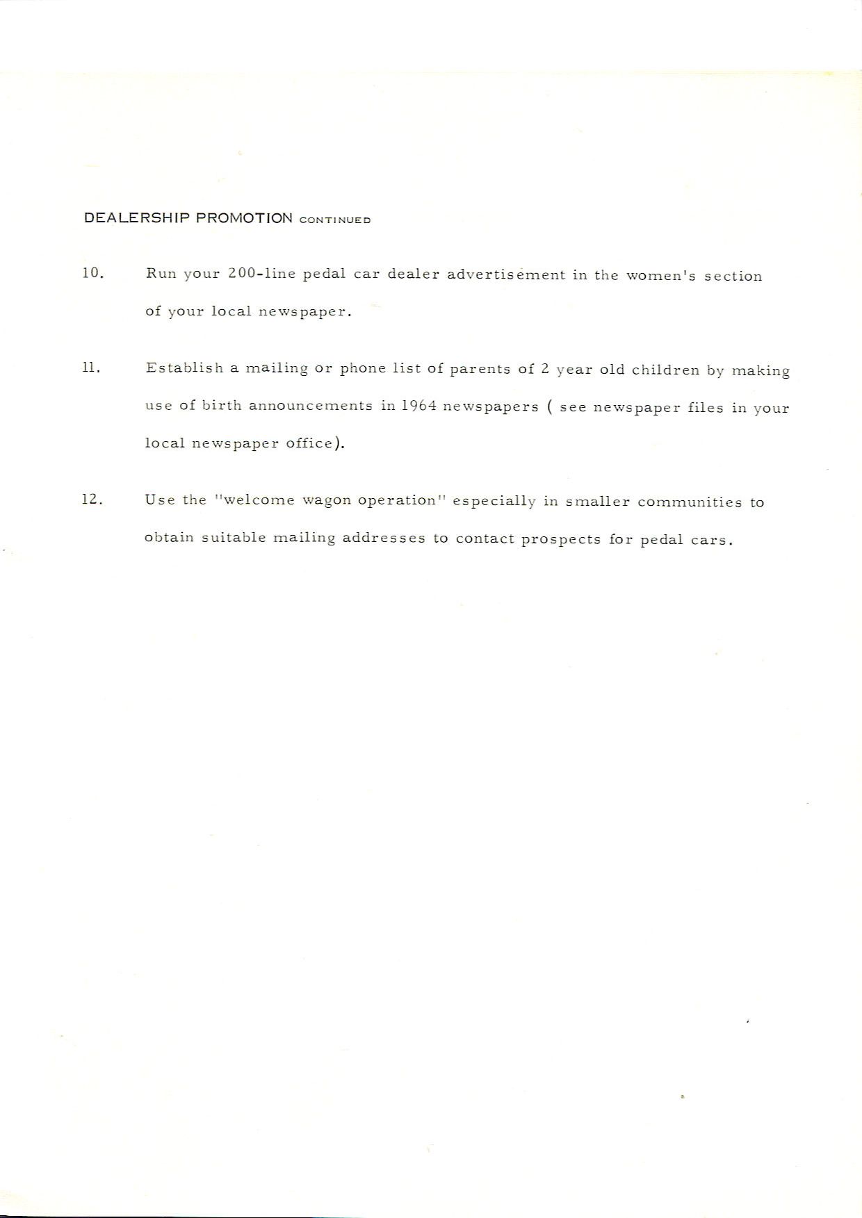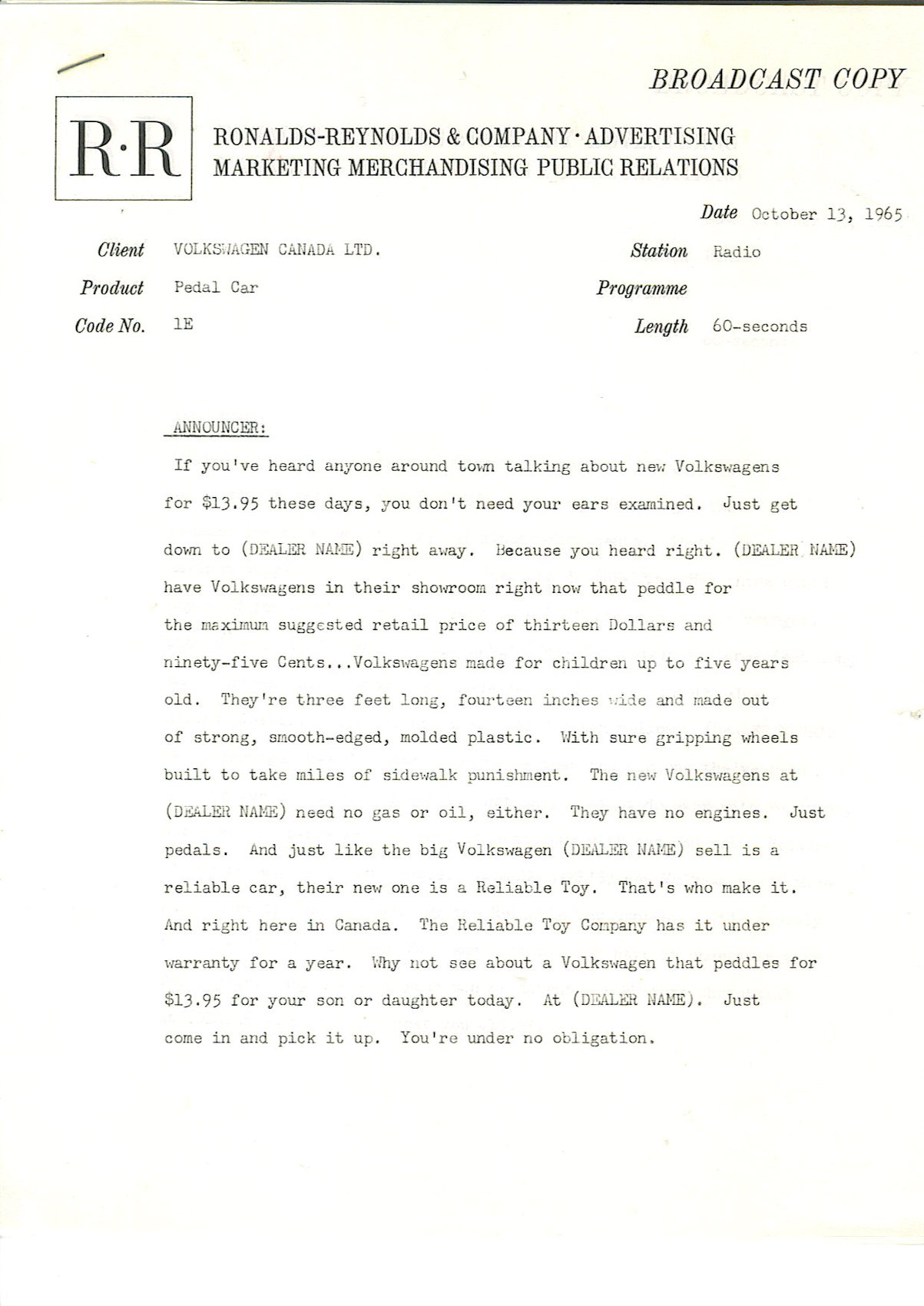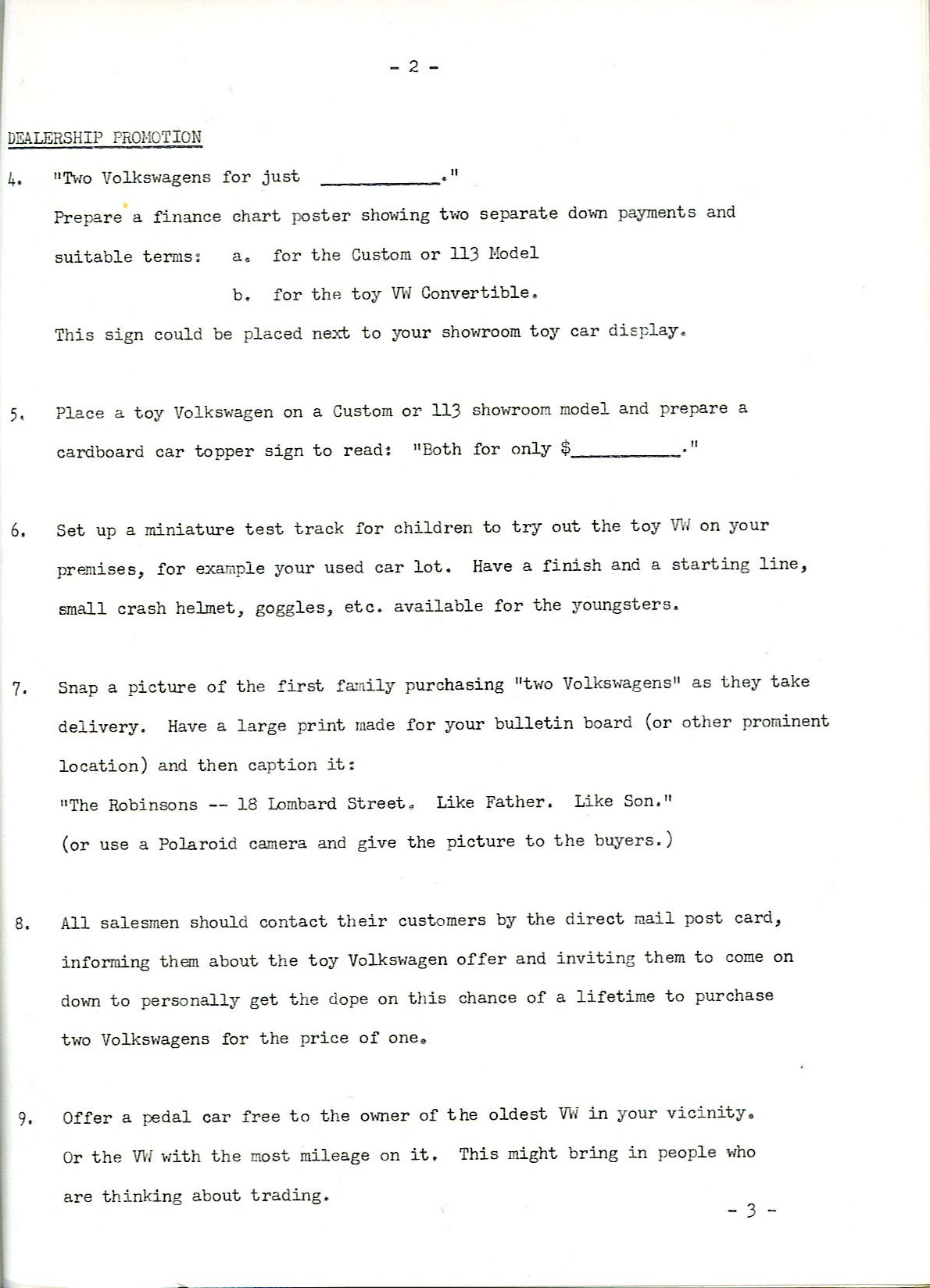 Some of the Volkswagen dealerships in Canada had a Pedal Car Promotional Campain. The promotion used the RELIABLE TOY pedal car to help sell the real size VWs at the time. Here are copies of the documents outlining a check list of things to do for the campaign.