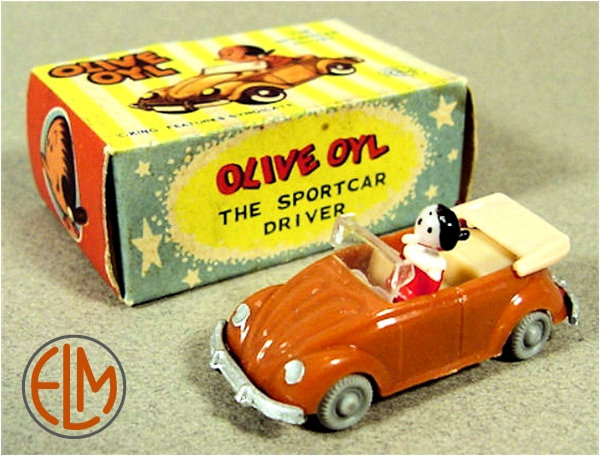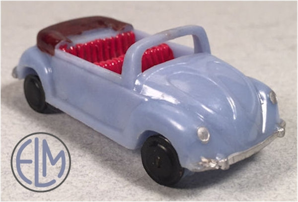 This is a copy of the Wiking 1/87 scale Volkswagen Convertible. All plastic construction with plastic wheels on metal axles and a clear plastic windshield attached as a separate piece. Came with a plastic character driver figure of Olive Oyl or Mickey Mouse. Also came without a driver figure in simulated wood crate cardboard box.