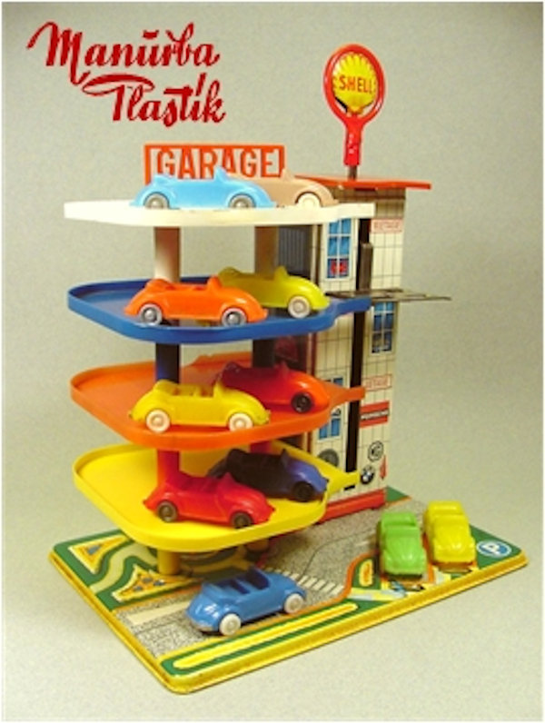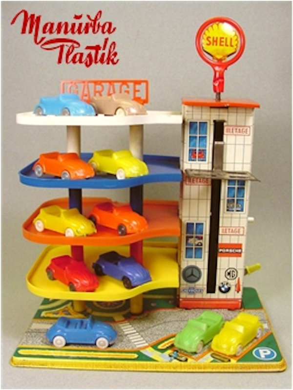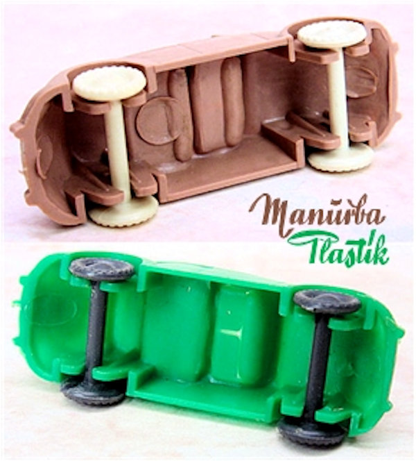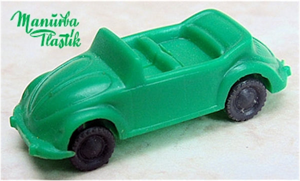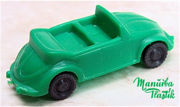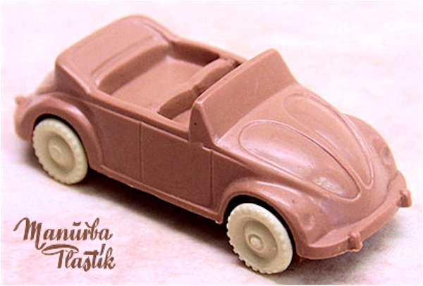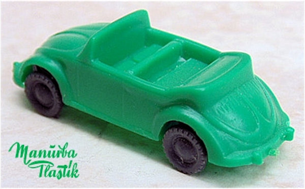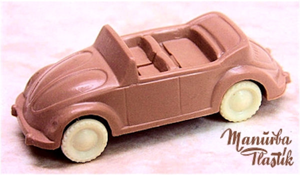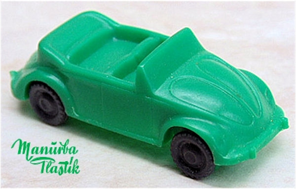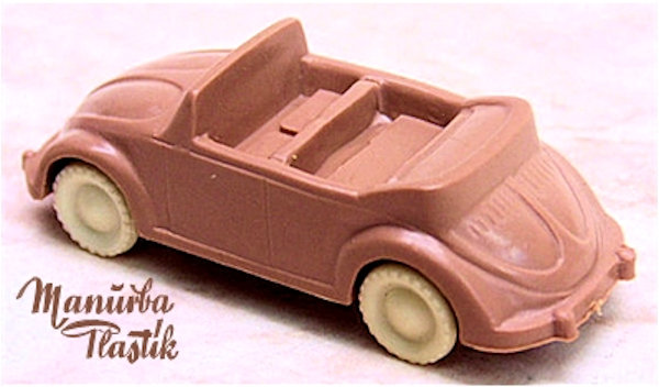 A Volkswagen Convertible with the top down, produced by MANURBA (Manfred Urban Plastikspielwaren, Bamberg, Germany). All plastic construction with details of the front and rear hood, door seams, interior and molded front and rear bumpers. Air louvers in the rear deck lid. No chassis and the plastic wheels and axles snap into the chassis. There is a large round mold mark under the rear seat area and smaller round marks under the front and rear hoods. No other markings. This model is identical to the other MANURBA convertible listed, except for the fact that the axle holders were different. MANURBA also produced Split Window Beetles: see also the listing under Split Window Toys (SW).