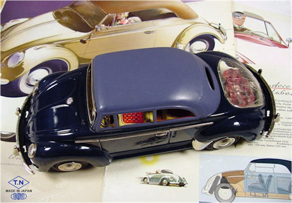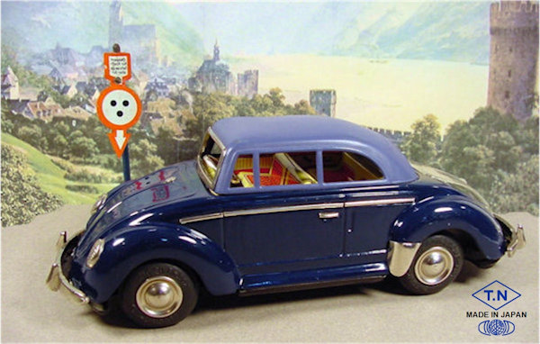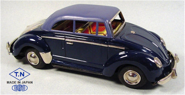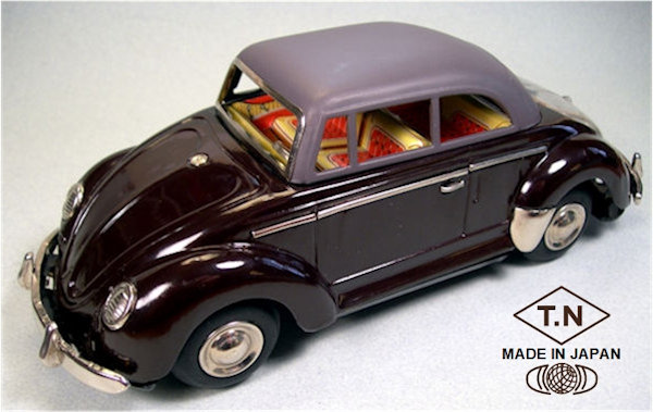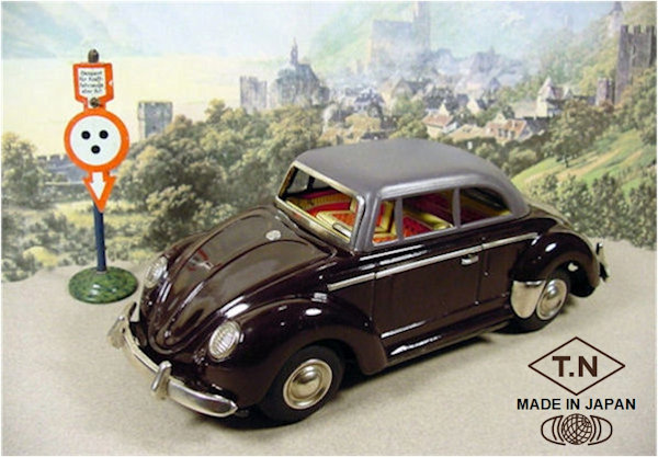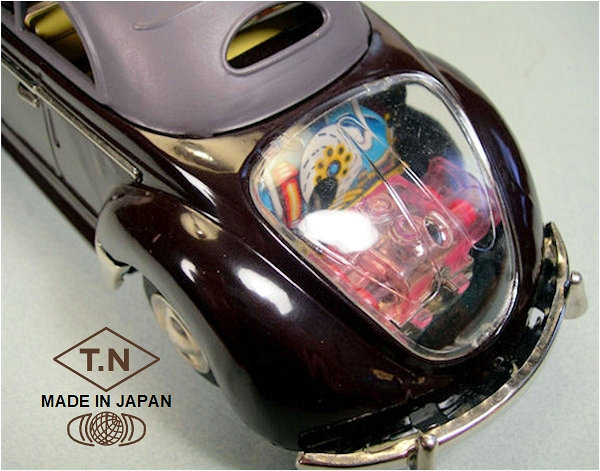 TOY NOMURA (T.N) produced this very nice tin plate Volkswagen Convertible with the top up. Tin body is painted a dark brown or dark blue and there are metal trim pieces that include windshield trim, headlights, VW hood emblem, side trim and door handles. The tin top has cutout windows, painted a pale grey or light blue color and attaches to the body. The tin interior has a very colorful lithograph design detailing the dashboard, door panels, seats and a tin steering wheel attaches to the tin interior. There are no TOY NOMURA markings anywhere on the VW. The tin chassis is painted black and has a friction motor with rubber tires, shiny hubcaps and tin bumpers with guards. The chassis is stamped MADE IN JAPAN. The rear deck lid is clear plastic insert for viewing the lithographed fan shroud and a clear motor with the four little silver colored pistons going back and forth as the friction motor in the VW car moves.