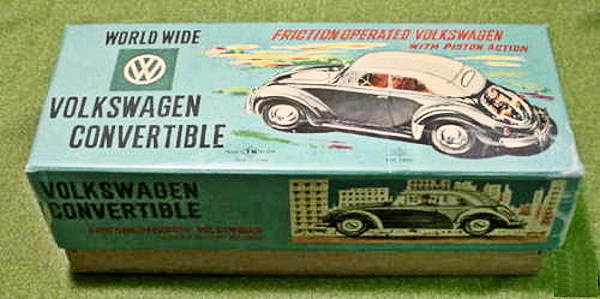 The TOY NOMURA Cabrio came in a very colorful blue box cover with a Bernd Reuters style drawing of the VW Cabrio. Printed on the box was WORLDWIDE VOLKSWAGEN CONVERTIBLE with the VW insignia. FRICTION OPERATED VOLKSWAGEN WITH PISTON ACTION and the T.N insignia was also printed on the box cover. The lower part of the original box was just plain cardboard.