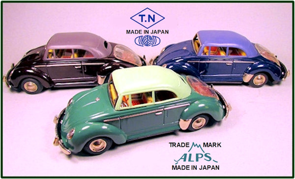 The TOY NOMURA Cabrio VW V1 is basically identical to the ALPS Cabrio VW except the ALPS Cabrio has the ALPS insignia in the rear seat lithograph. It is also known that ALPS and TOY NOMURA had a connection in the 1950s as there is a similar ALPS and TOY NOMURA tin Oval Window VW produced as well. See the Oval Window section on the site for further information.