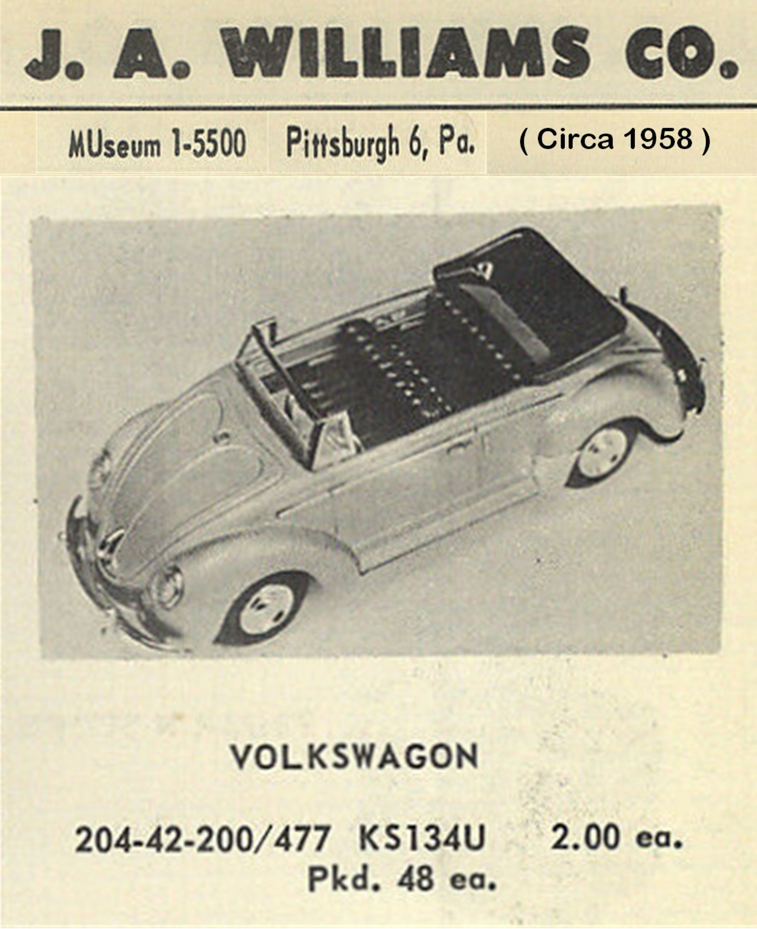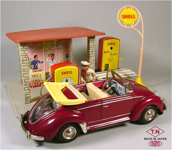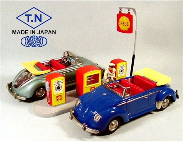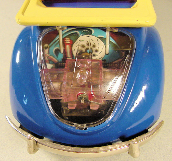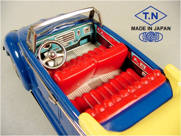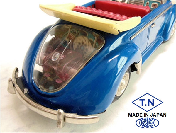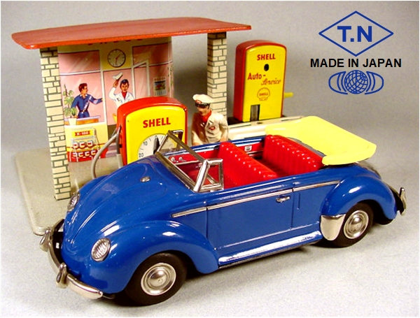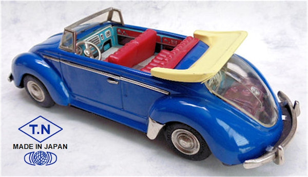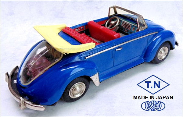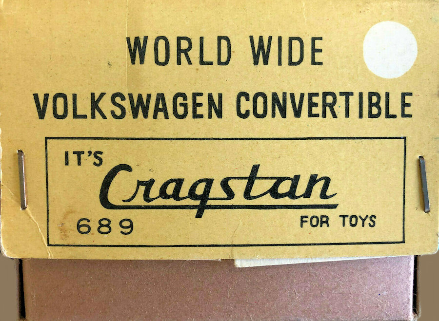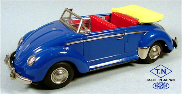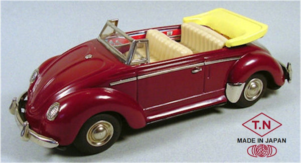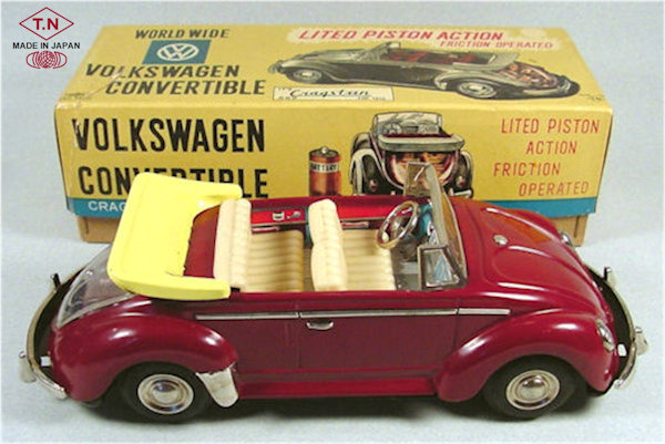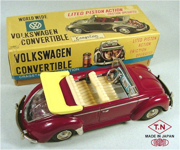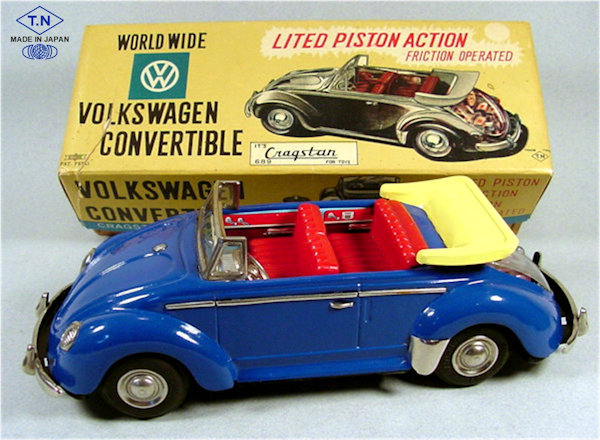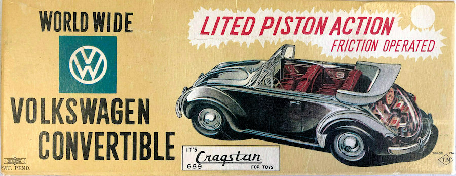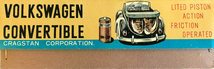 A very nice tin plate Volkswagen Convertible with the top down. Tin body painted and there are metal trim pieces that include headlights, VW hood emblem, side trim and door handles. The tin windshield with plastic insert and a metal folded down top attaches to the body. The interior has a lithograph design detailing the dashboard and door panels. Plastic seats and steering wheel finishes off the details. The tin chassis with tin bumpers is painted black and has a friction motor with rubber tires and metal hubcaps. The rear deck lid is clear plastic for viewing the lithographed fan shroud and a clear motor with the four little pistons going back and forth as the VW car moves. There is a battery compartment for one “C” cell battery and a switch that illuminates the engine compartment. The original shipping box has some colorful artwork of a Cabrio Volkswagen. Sold under the CRAGSTAN Corporation name.