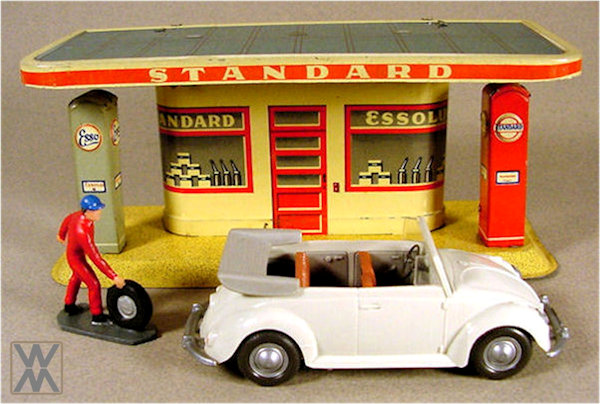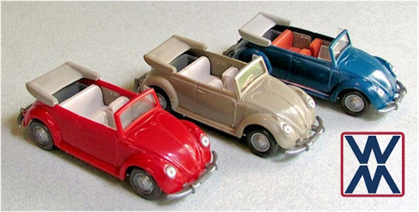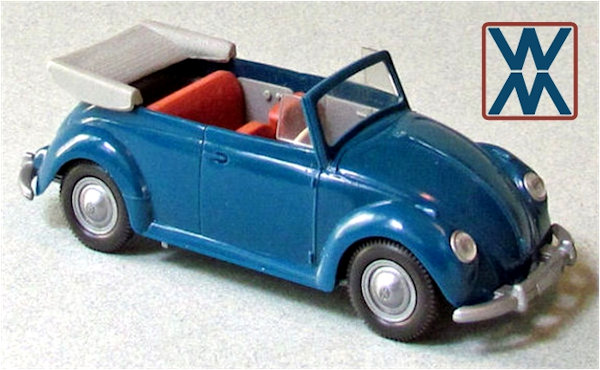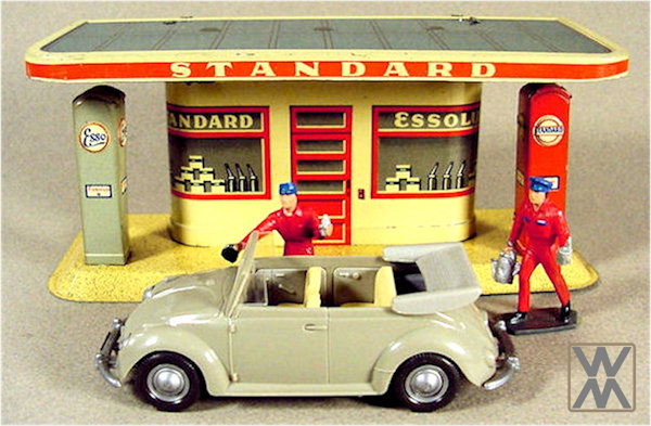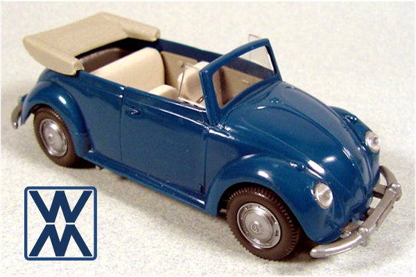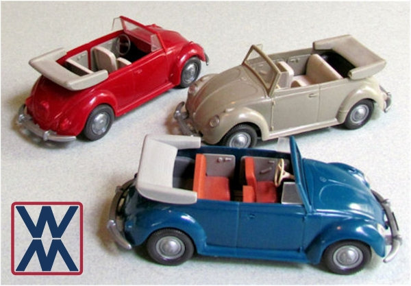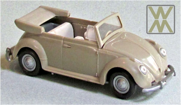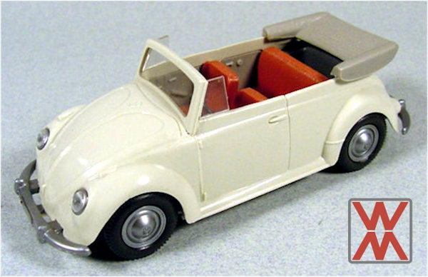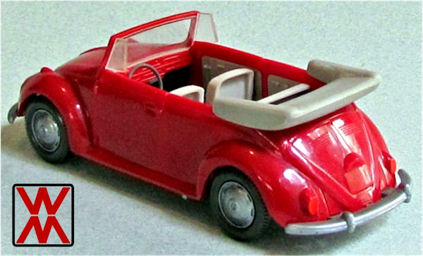 A very detailed model of the Volkswagen Convertible with the top down. All plastic construction with metal axles. Body can be removed to show a very detailed chassis with spare tire and engine. Production changes in the real or prototype Beetle Convertible were reflected in these models throughout the years of production. They were sold in toy stores and also and given away by VW dealers as promotional items.
