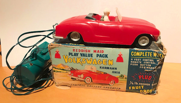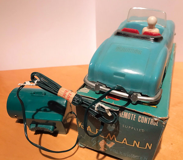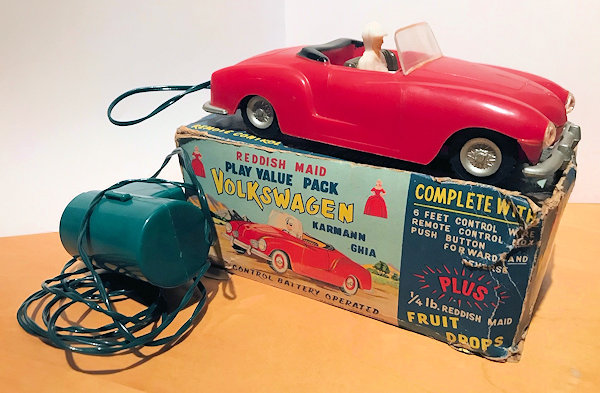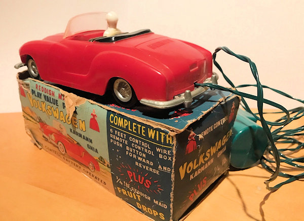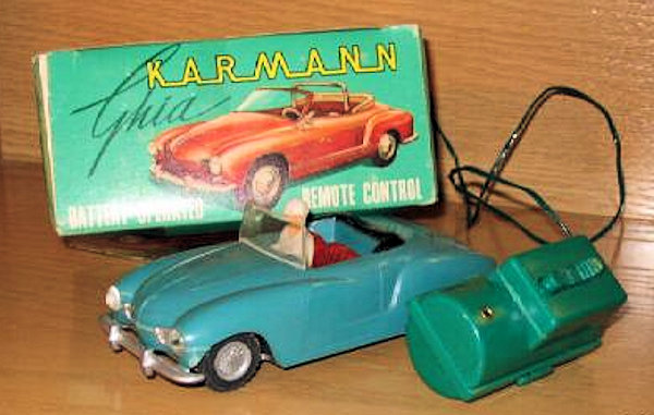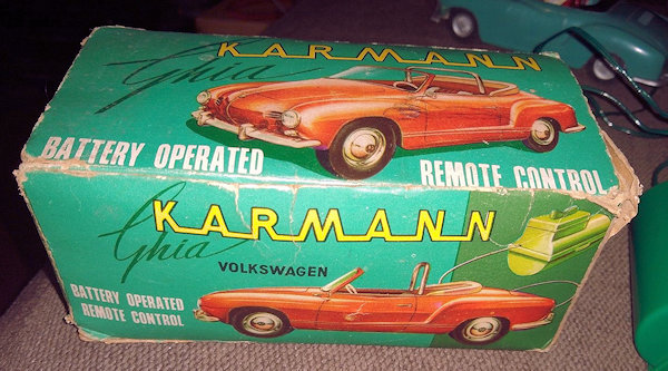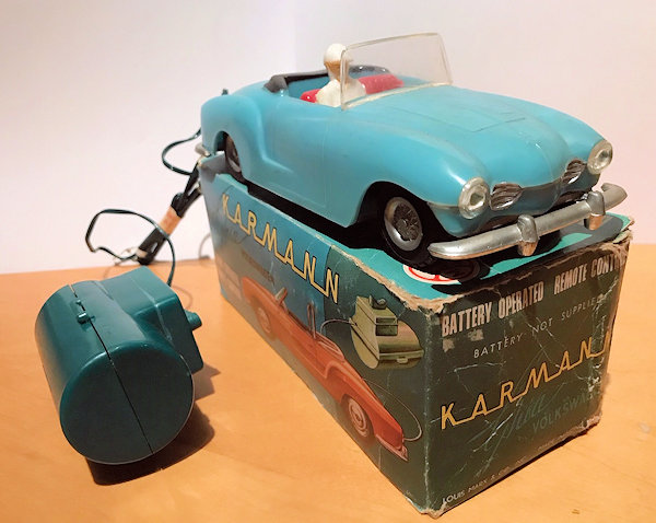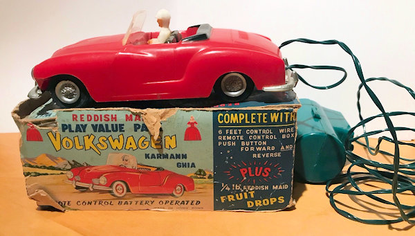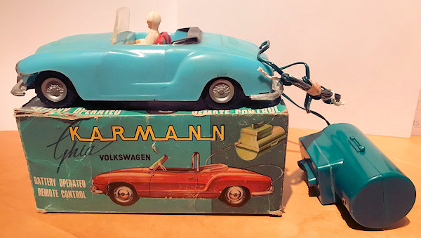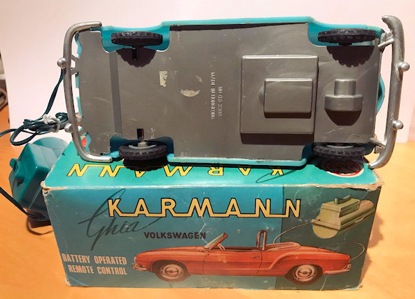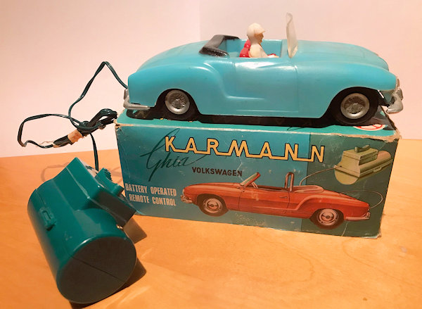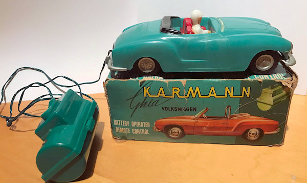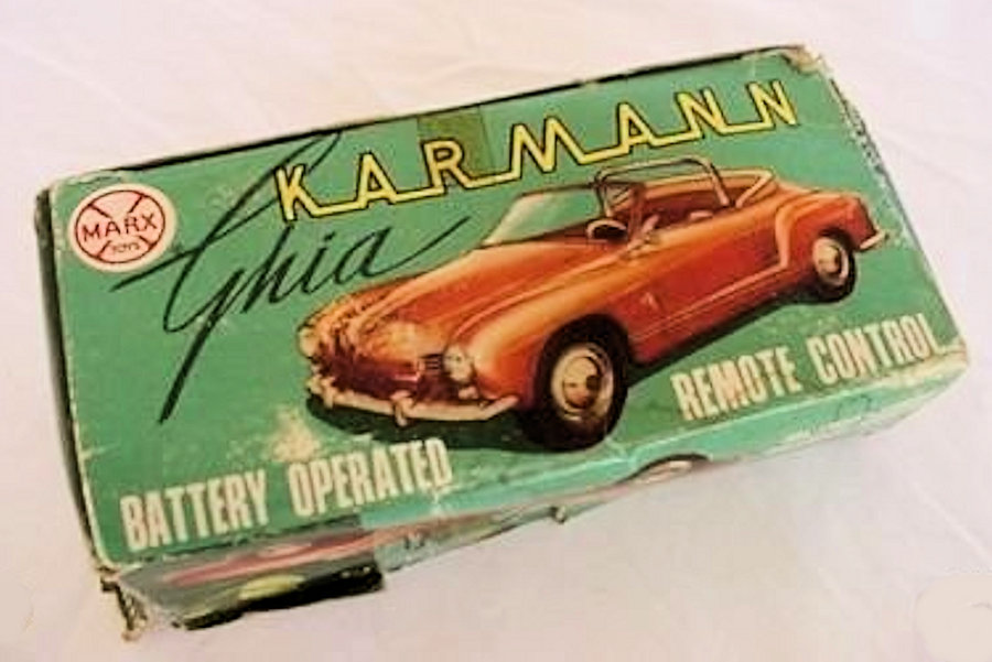 This is a model of a 1955-59 era Lowlight Karmann Ghia VW Convertible that was produced by Louis Marx Toys (USA) and was made in Hong Kong in the 1958-1960s. The plastic body has the top down and has details of the front hood, rear hood and door seamlines. The front section has clear plastic headlights, hood trim, VW logo and of course the small grill air louvers. The rear section shows the engine air louvers and license plate area but no taillights. The details of the interior has two red or grey seats, folded down black convertible top and a white plastic driver sitting on the right-hand side. There is a clear plastic windshield that is glued to the body and appears to be fragile as it is often missing. The chassis is also made of plastic and has molded the front and rear bumpers usually painted silver. There are rubber tires on silver plastic wheels and this MARX Karmann Ghia VW features a battery operated remote control. The hand held control holds the batteries, two buttons for forward or reverse and 6 feet of wire that attaches to an electric motor mounted on the chassis. The chassis is marked NO 3303 MADE IN HONG KONG and glued to the body.