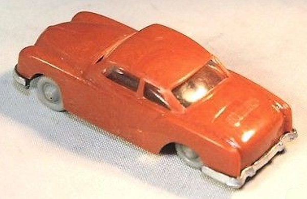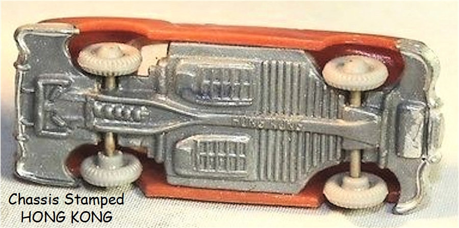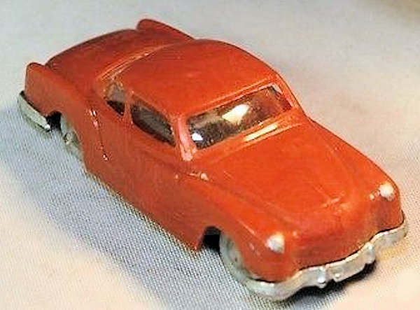 This is a model of a 1955-59 era Lowlight Karmann Ghia VW Coupe that was produced by Louis Marx Toys (USA) and was made in Hong Kong in the 1958-1960. The plastic body has cut out windows and a clear plastic insert for the windows. The body has details of the front hood, rear hood and door seamlines. The rear hood has air louvers. There is a dab of silver paint for the headlights. The plastic chassis is somewhat detailed and has the front and rear bumpers in the molding. There are grey plastic wheels on metal axles attached to the chassis which is painted silver. The chassis is stamped HONG KONG and is glued to the body.