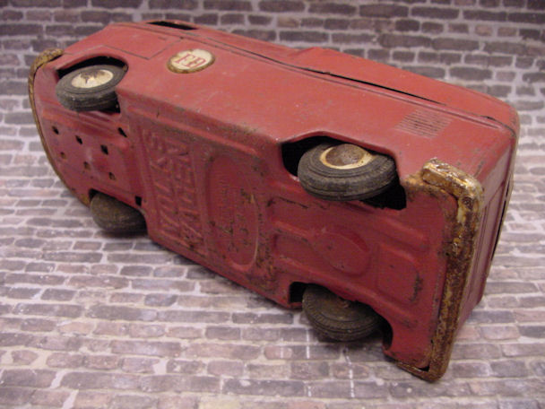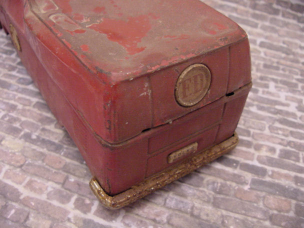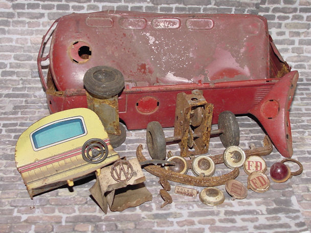 The VW Bus is built in three tin sections, lower/chassis, roof and front clip. Using a spring hook and going through the windows and wheel wells, the connecting tabs were bent open and the top was removed from the lower section. WOW, did I ever open up a hornet’s nest and was very surprised to discover what was inside – just that – a pair of hornet’s nests. I guess you could call them VW Bugs when they were around and fortunately, they had left the nest some time ago. Once the top was off, the roof light, front clip, lithographed interior, rear wheel assembly, paper resonator and friction motor was removed. The tin pieces such as the 3 round FD emblems, headlights, “W” emblem, bumpers and rear license plate was also removed. Now the process of smoothing out the dents, paint striping, cleaning and figuring out what is the best way to handle the condition of some of the parts. For example, the tin nickel-plated bumpers were rusty and pitted and could not be polished so they would have to be filled and painted.