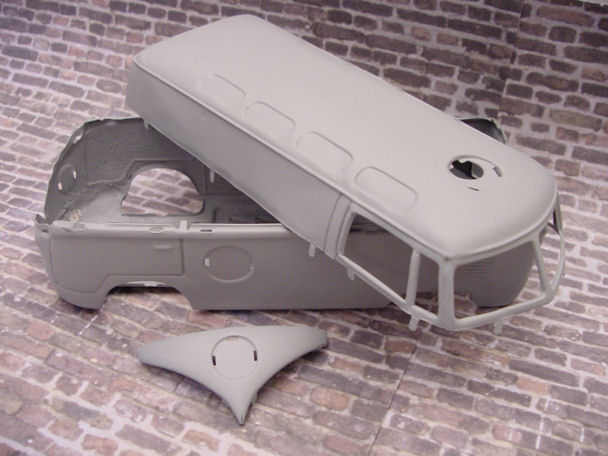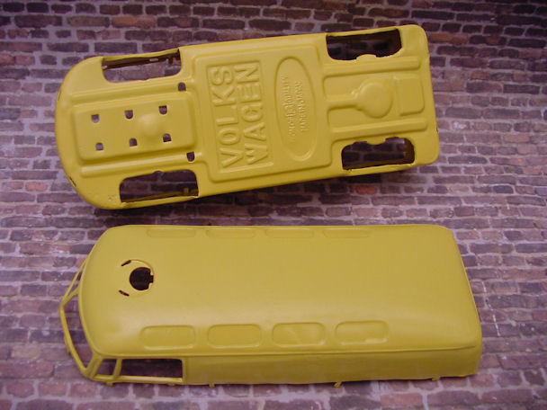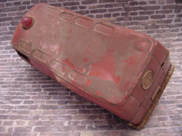 This BANDAI Fire Department Bus was found in a barn and had been parked there for some time, after surviving some heavy duty play time and weather conditions. This type of VW Panel Bus itself, in excellent condition, is very collectable, especially with the Fire Department theme, nice detailing lines and check out those roof windows on a panel Bus. Now looking at this rusty crusty BANDAI beater Bus with the smashed in roof, oxidized paint, dirt, rust, no need to go on, why and where do you start. Actually, the best thing the Bus has going for itself is that it is complete, not missing any parts and I had the vision of making it an ADAC autobahn vehicle conversion. I was contemplating getting a tetanus shot in case I get some rusty cuts during the project but decided to just get going, taking things apart.