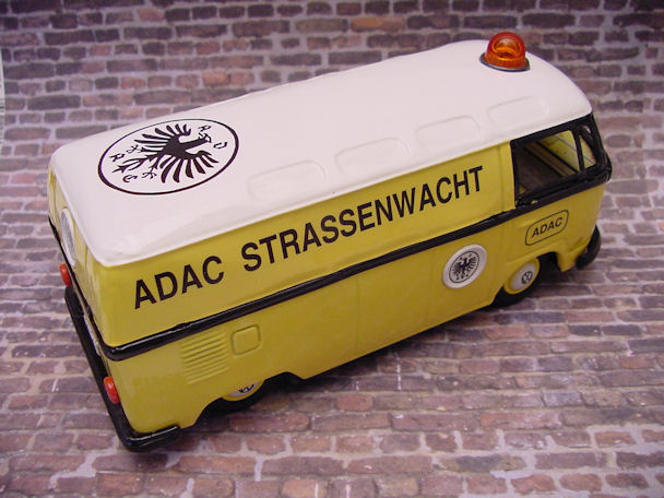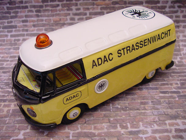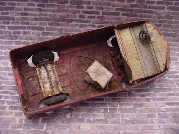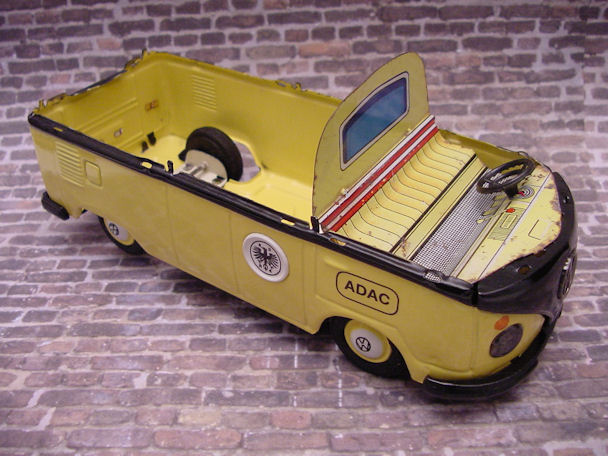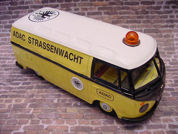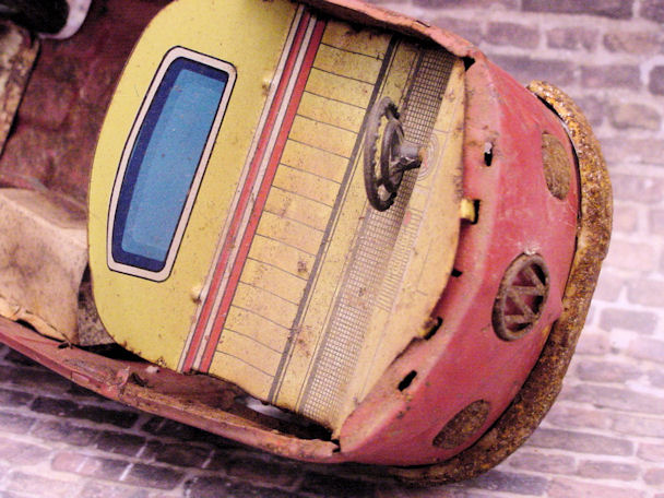 The friction motor was cleaned and oiled and the original paper resonator was used as a pattern to make a new resonator. I also decided to make some red taillights for the VW Bus using some brass brads. An orange roof light was found and would be better suited for the ADAC theme instead of the red original light. Although the Bus was left in the barn under the weather conditions, the tin lithograph interior was still in good condition and cleaned up very nice with a cleaner wax. Now the Bus was ready for final assembly. Starting with the lower/chassis section, the wheel assembly, paper resonator, friction motor, bumpers, headlights, “W” insignia, taillights and rear license plate were carefully attached. The front clip and tin lithograph interior were attached next to the lower/chassis section. The orange light and metal bezel were then attached to the roof section. The roof section was then mated to the lower/chassis section being careful lining up the metal tabs and bending them over with a wooden stick and not damaging the paint. OK, now the project is completed and the BANDAI ADAC Restor-Version Bus shines in all its glory.