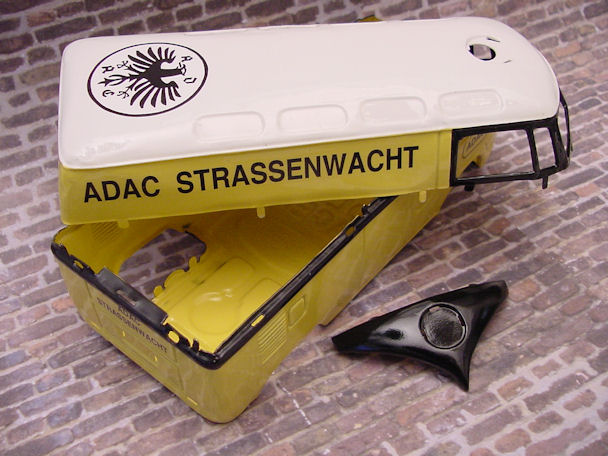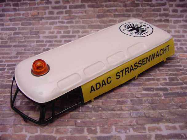 Using a special plastic hand tool and wood block, the dents were smoothed out and the tin body was paint striped and wire brushed. The 3 round emblems, hubcaps, and bumpers were also striped cleaned. All the tin parts were then primered for final color painting. The white, black and yellow painting for the body tin was applied in several stages masking off the different color sections. It takes several days to complete the painting process since the different color sections need to dry over night. Using a computer graphics program, I made the ADAC graphics and then printed them using special water transfer decal paper and a laser printer. The decals were applied and then all the painted parts were clear coated.