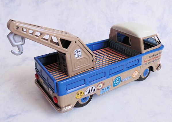 I picked up these two 1960s BANDAI VW Buses some years ago as it was rusty, dented and in need of repair. I also had an extra wrecker boom from another vehicle and thought of making a Restor-Version Shop VW Wrecker Bus. The Restor-Version shop could also use a courtesy VW Bus as well.