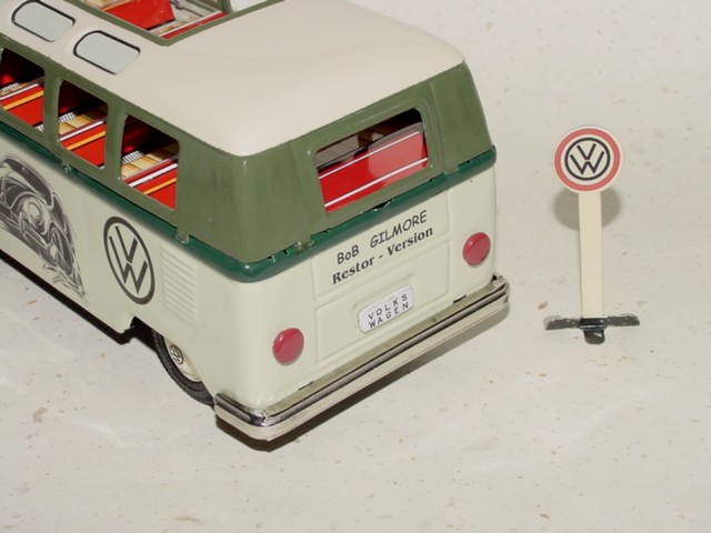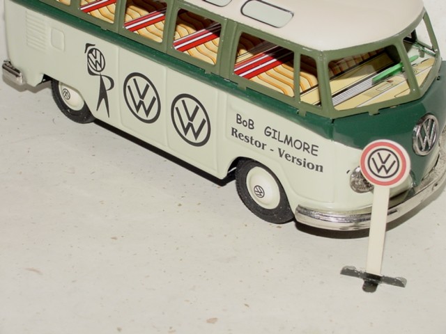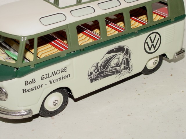 The BANDAI VW Buses was taken apart, sand blasted, body repairs done and painted. The small tin parts were cleaned, painted or polished. The friction motor and tires were made like new.