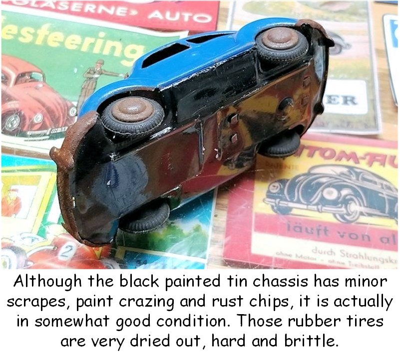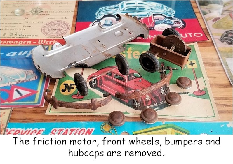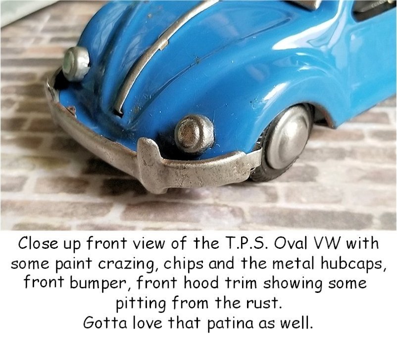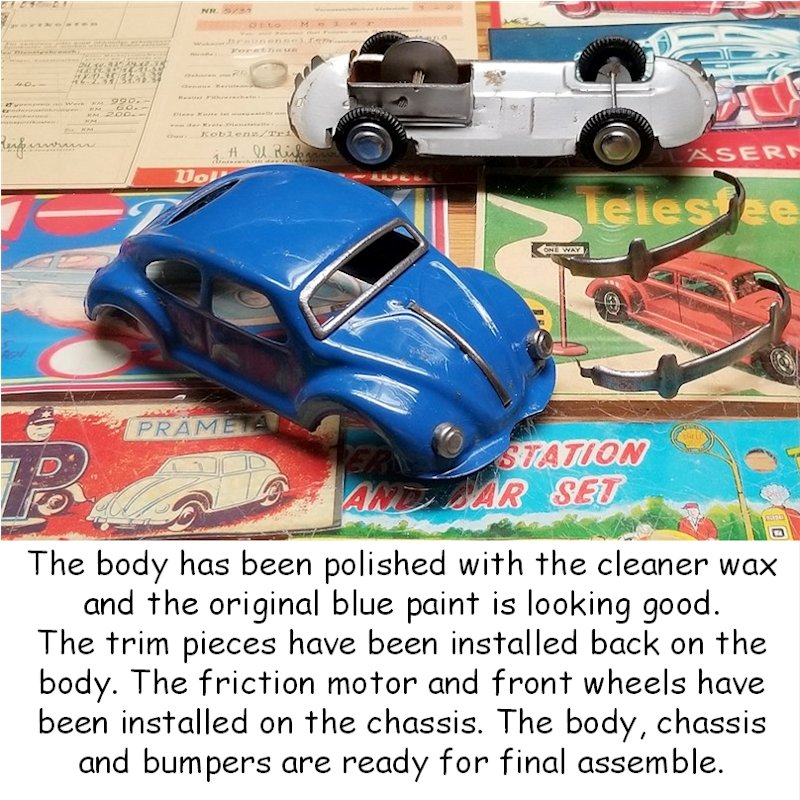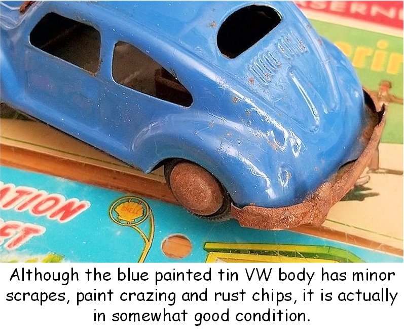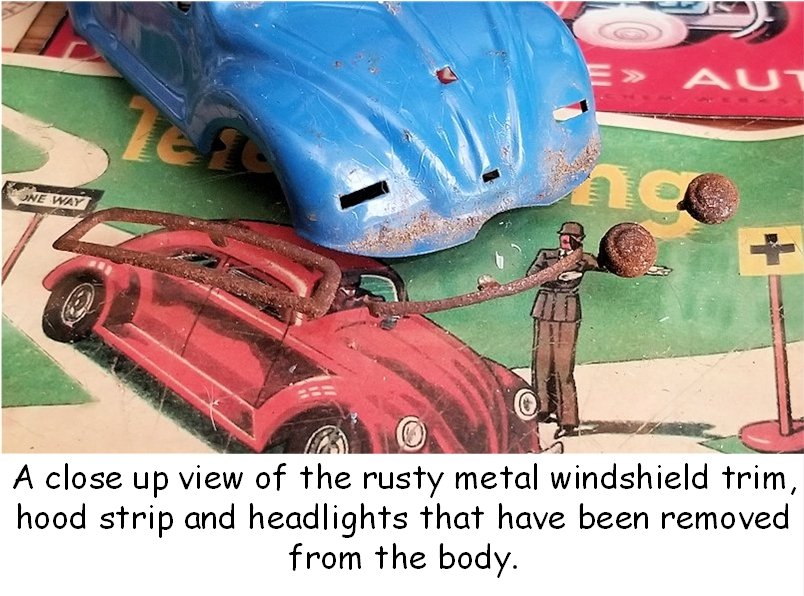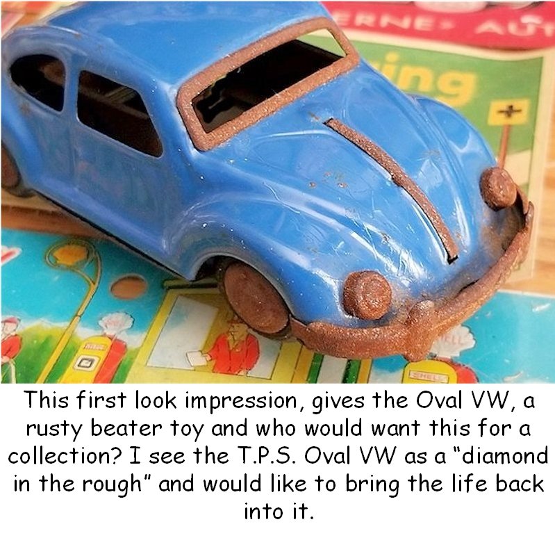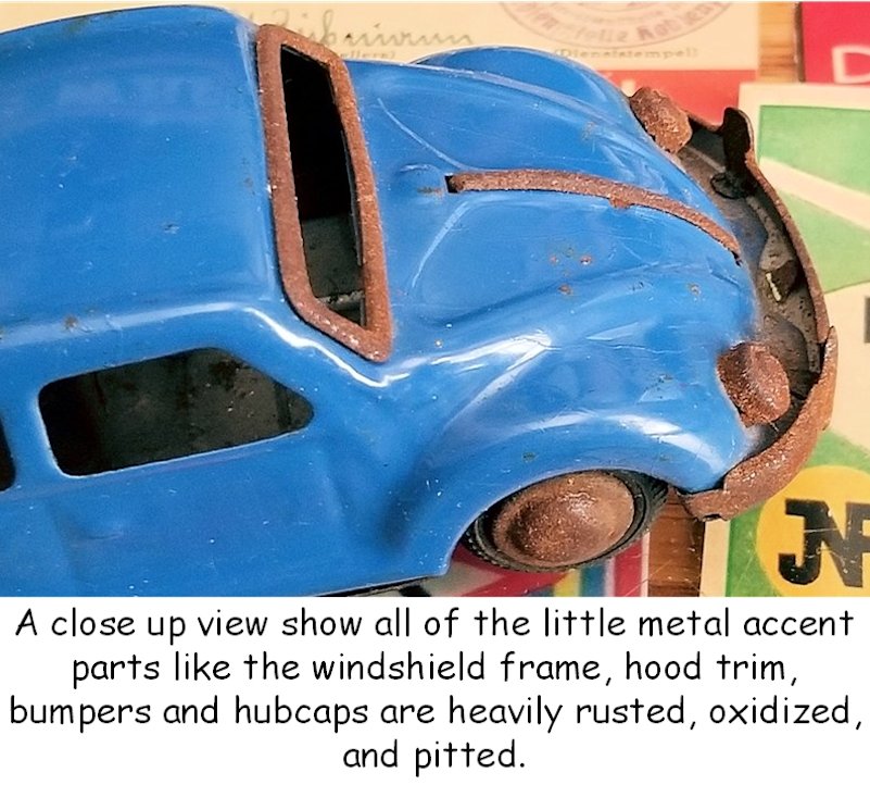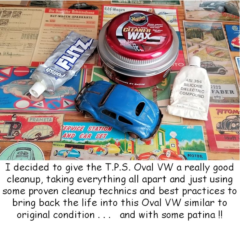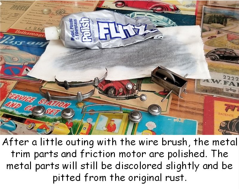 Although the blue painted T.P.S. Oval VW tin VW body has minor scrapes, paint crazing and rust chips, it is actually in somewhat good condition. Now all of the little metal accent parts like the windshield frame, hood trim, bumpers, hubcaps, friction motor and axles are heavily rusted, oxidized, and pitted. This first look impression, gives the Oval VW, a rusty beater toy and who would want this for a collection? I see the T.P.S. Oval VW as a “diamond in the rough” and would like to bring the life back into it. I decided to just give it a really good cleanup, taking everything all apart on the Oval VW, and just using some proven cleanup techniques and best practices to bring back the life into this 1950s era Oval Window VW similar to the original condition? Check out the set of photos showing the before and after results!
