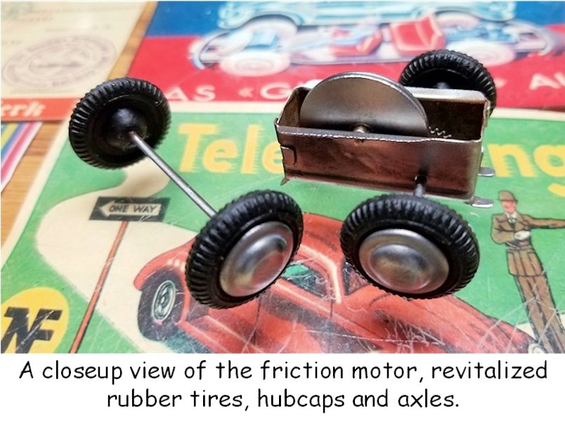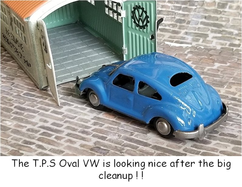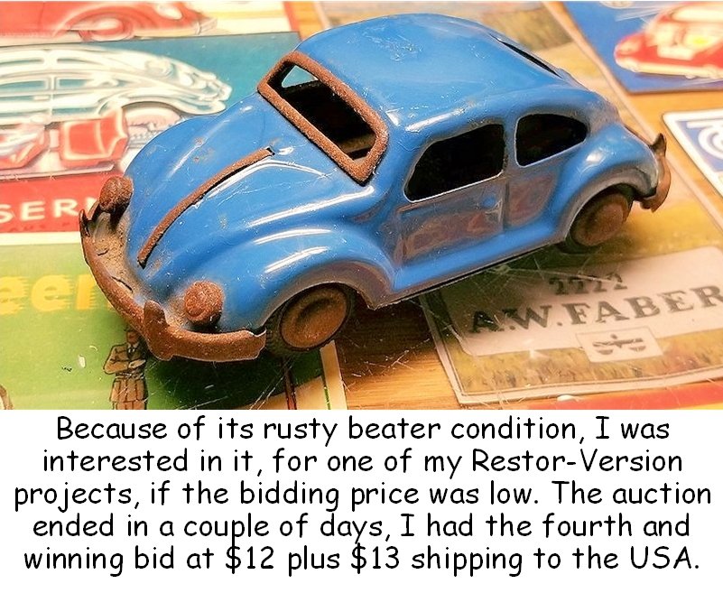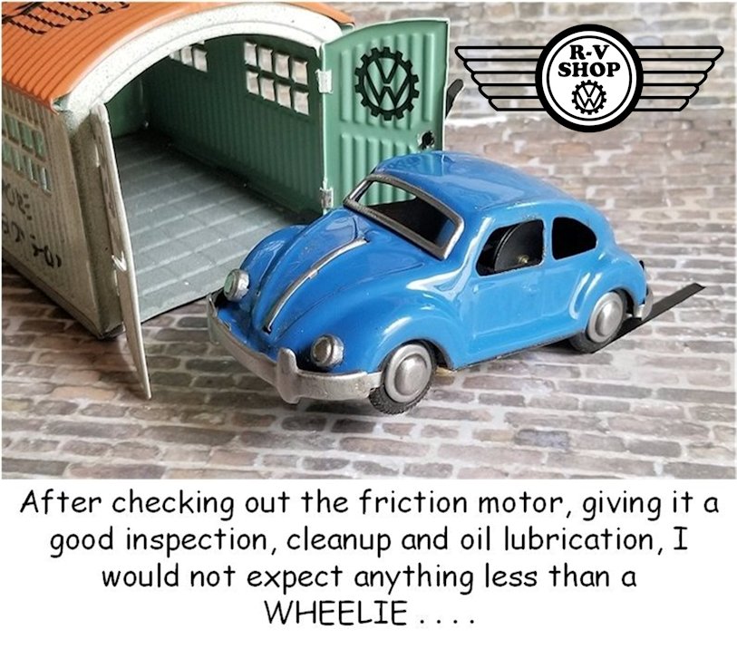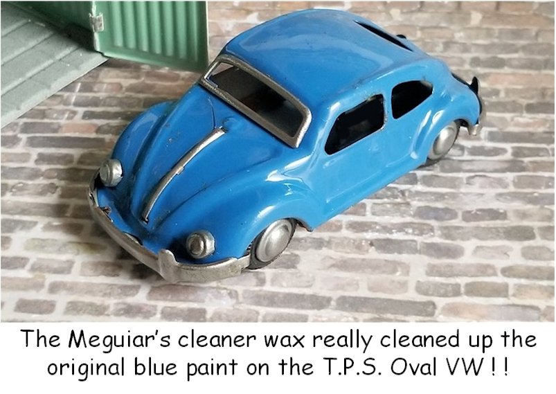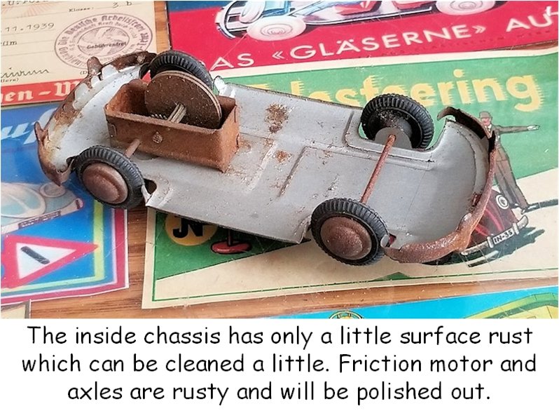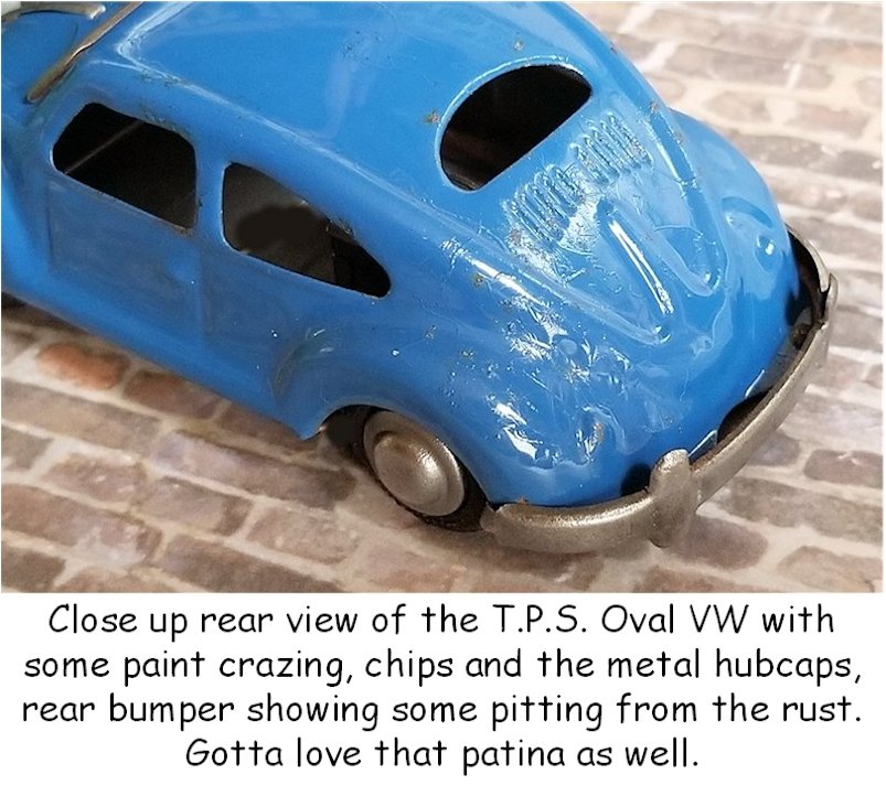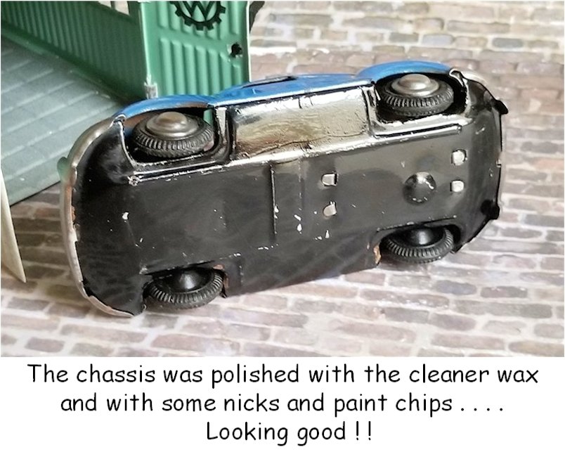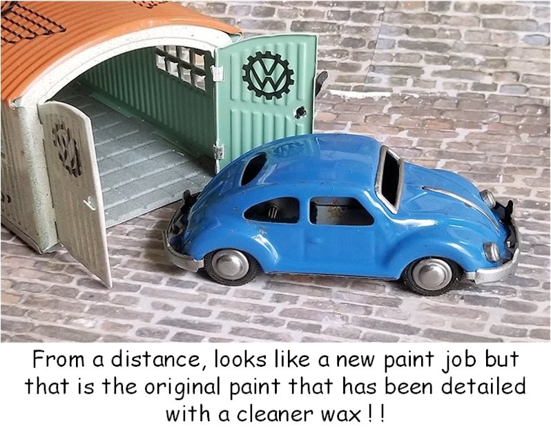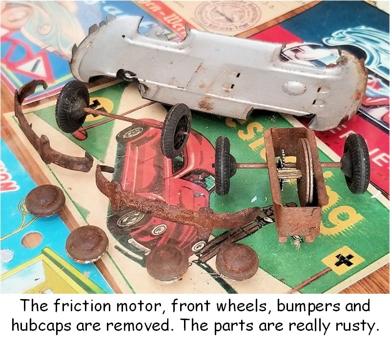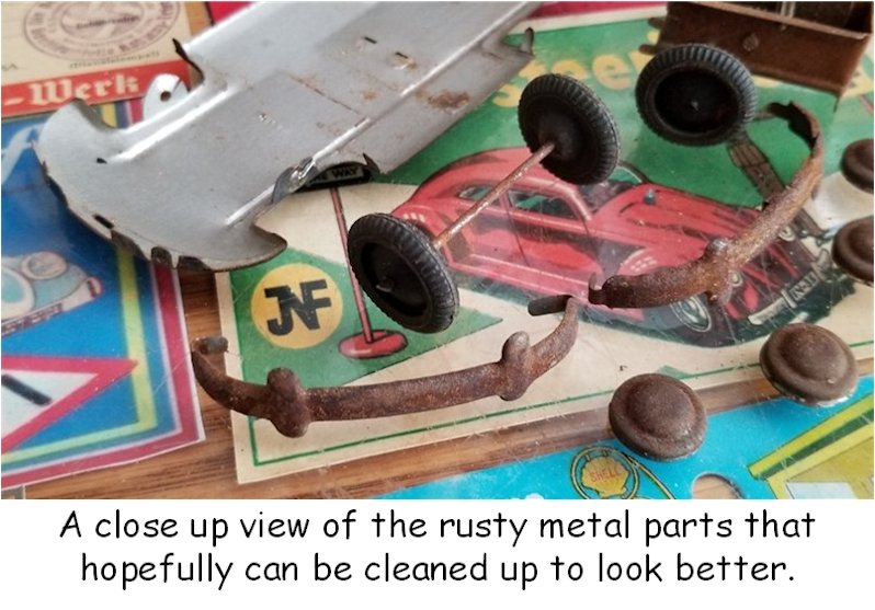 Although the blue painted T.P.S. Oval VW tin VW body has minor scrapes, paint crazing and rust chips, it is actually in somewhat good condition. Now all of the little metal accent parts like the windshield frame, hood trim, bumpers, hubcaps, friction motor and axles are heavily rusted, oxidized, and pitted. This first look impression, gives the Oval VW, a rusty beater toy and who would want this for a collection? I see the T.P.S. Oval VW as a “diamond in the rough” and would like to bring the life back into it. I decided to just give it a really good cleanup, taking everything all apart on the Oval VW, and just using some proven cleanup techniques and best practices to bring back the life into this 1950s era Oval Window VW similar to the original condition? Check out the set of photos showing the before and after results!