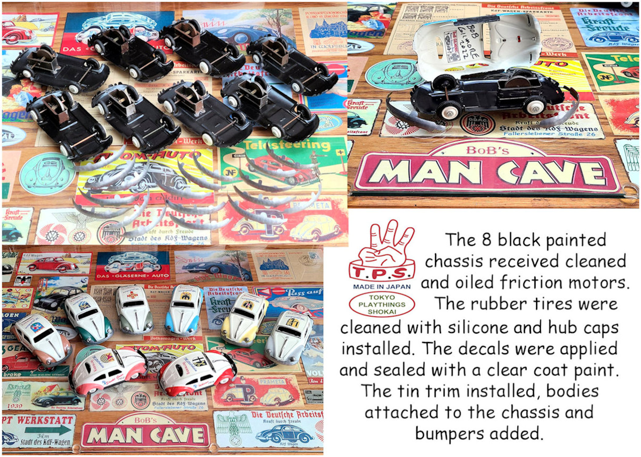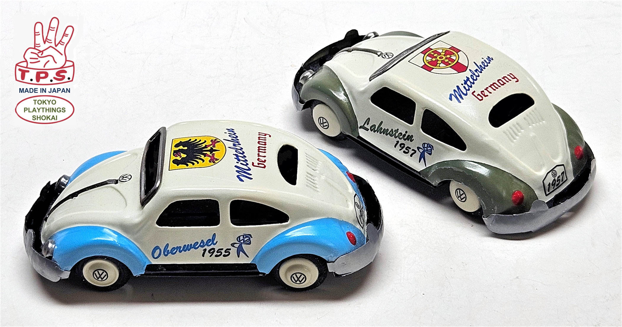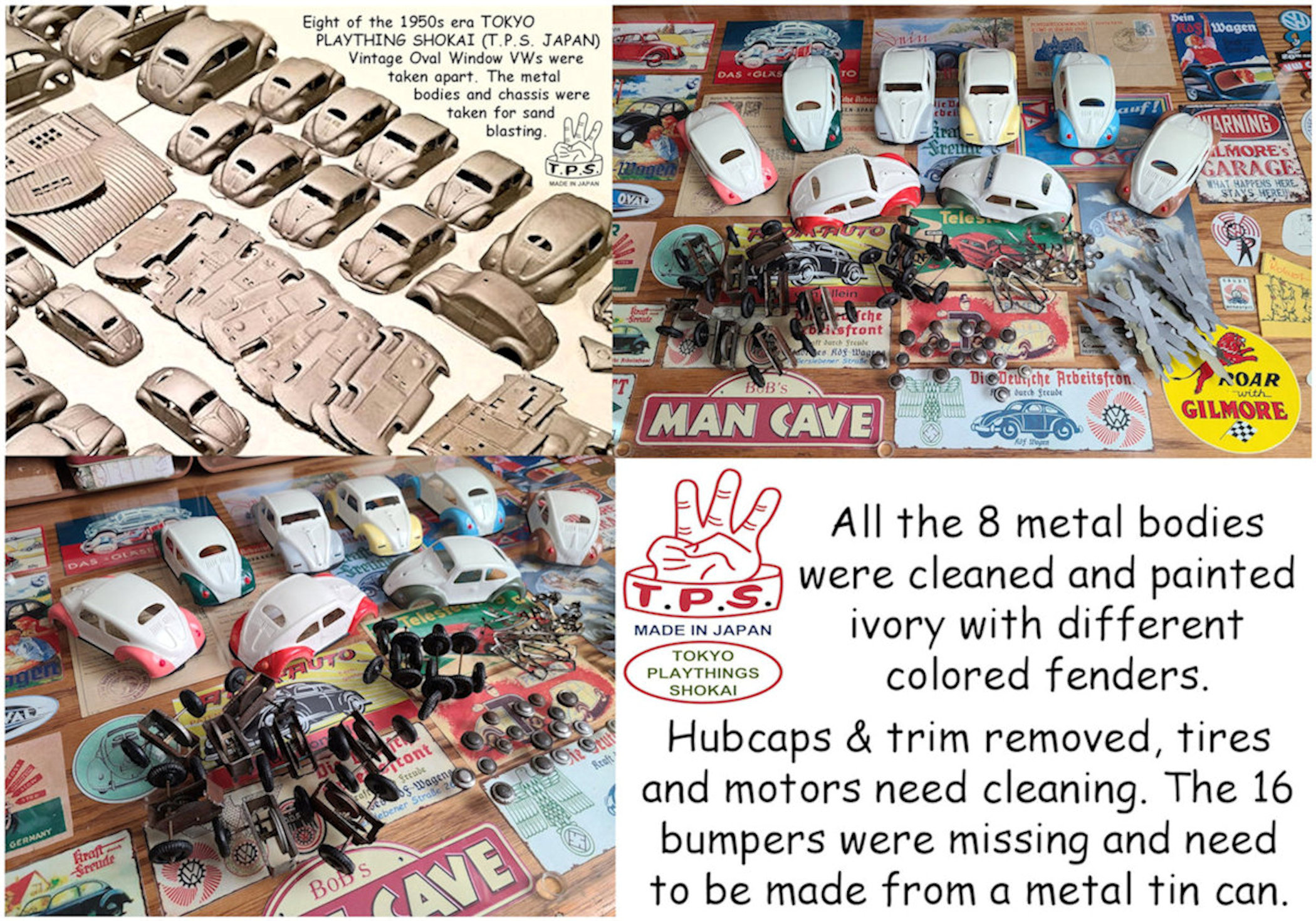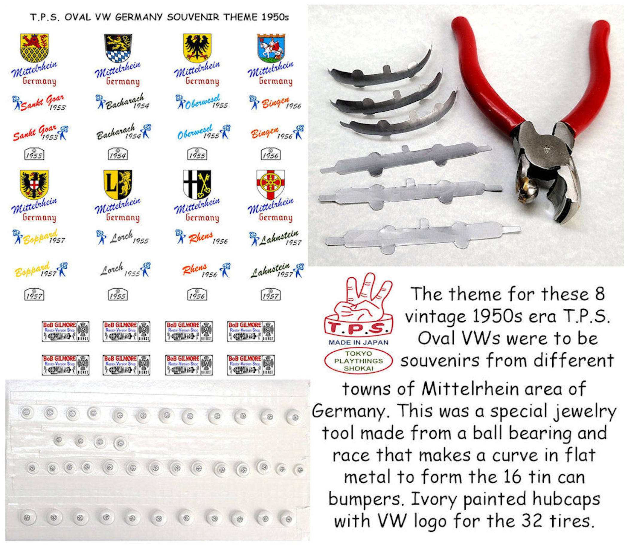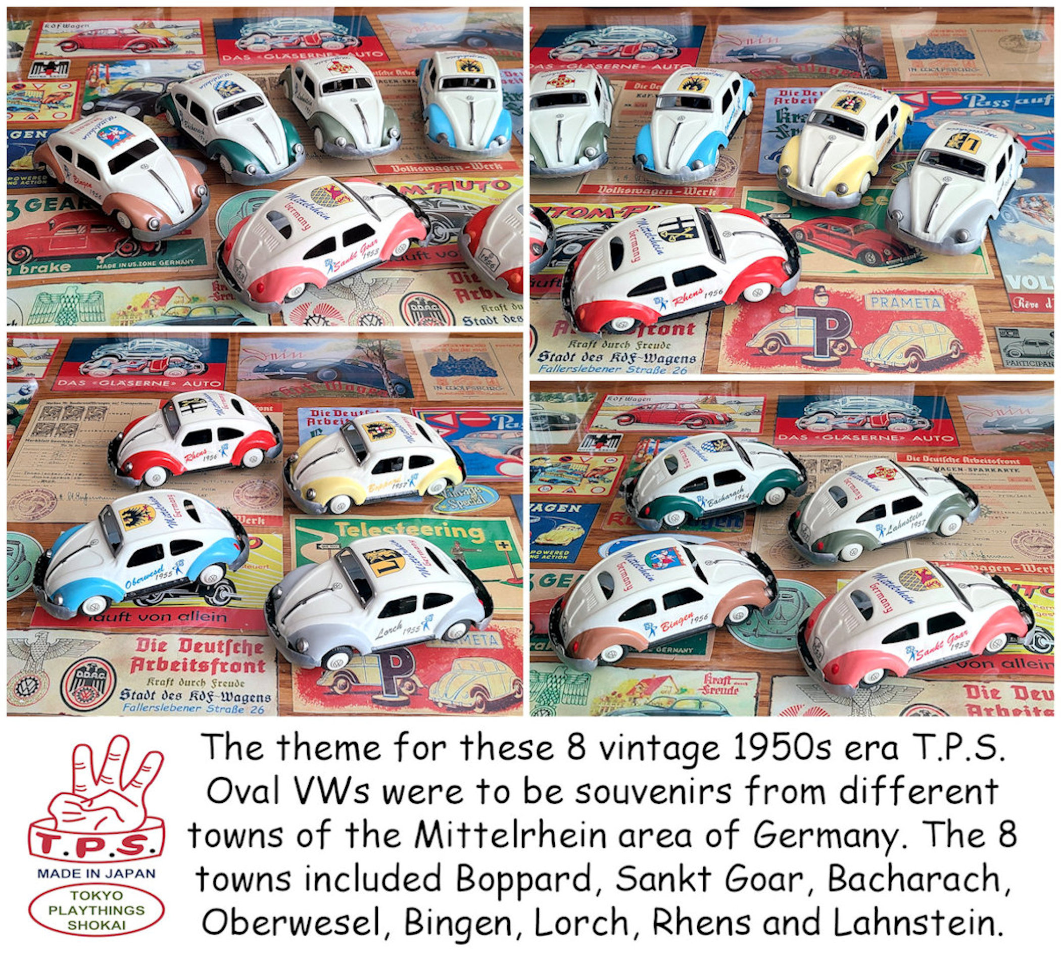 These 8 T.P.S. (TOKYO PLAYTHING SHOKAI) 1950 era Oval Window VW tin toys were collected over the years and all of them were well played with, dented, broken, rusty, missing bumpers and all in need of repair. They would all be going through the Restor-Version Shop and the theme for these 8 vintage 1950s era T.P.S. Oval Window VWs were to be toy souvenirs from different tourist towns of the Mittelrhein area of Germany. The 8 towns included Boppard, Sankt Goar, Bacharach, Oberwesel, Bingen, Lorch, Rhens and Lahnstein.